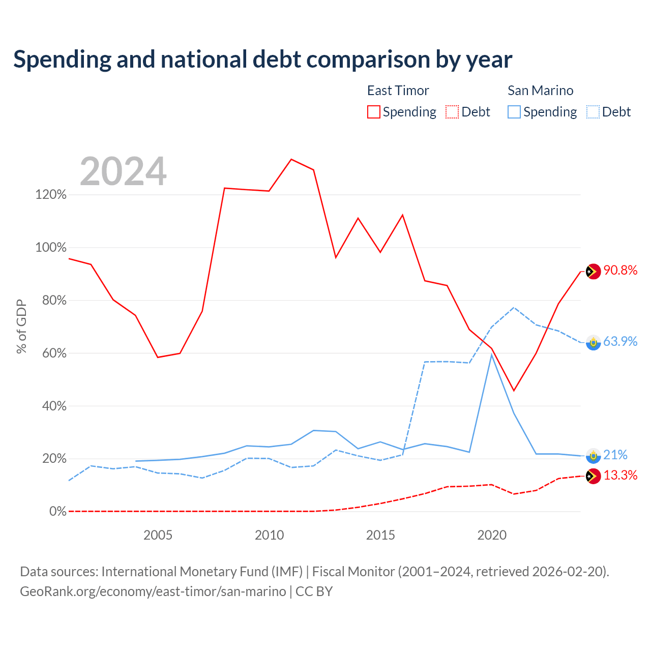 East Timor has $249M in government debt (13.3% of GDP), compared to $1.39B (63.9% of GDP) in San Marino.