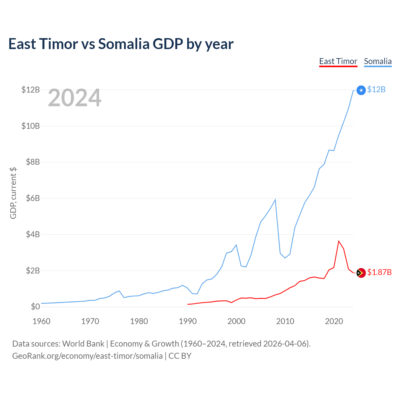 East Timor has a GDP of $1.87B compared to $12B for Somalia, ranking 181/197 and 150/197 by economy size, respectively.