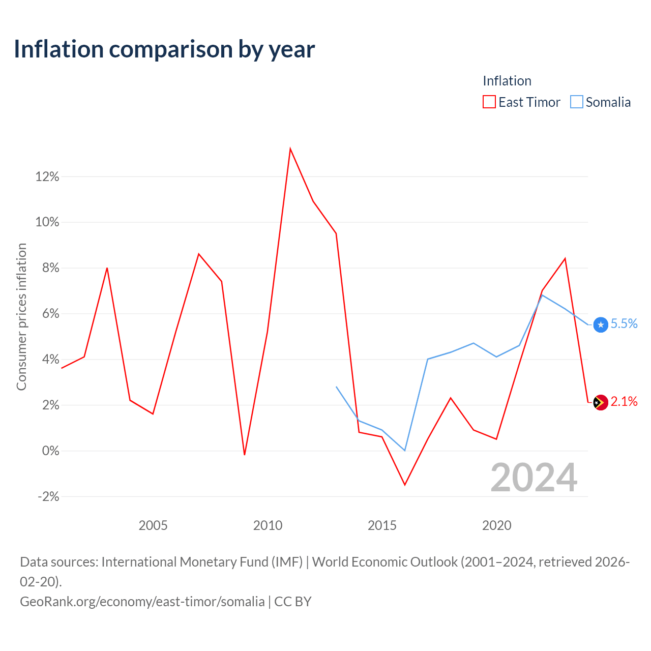 Over the past 12 years, East Timor has recorded an average annual inflation rate of 2.91%, compared with 3.77% in Somalia. In 2024, inflation was 2.1% in East Timor and 5.5% in Somalia.