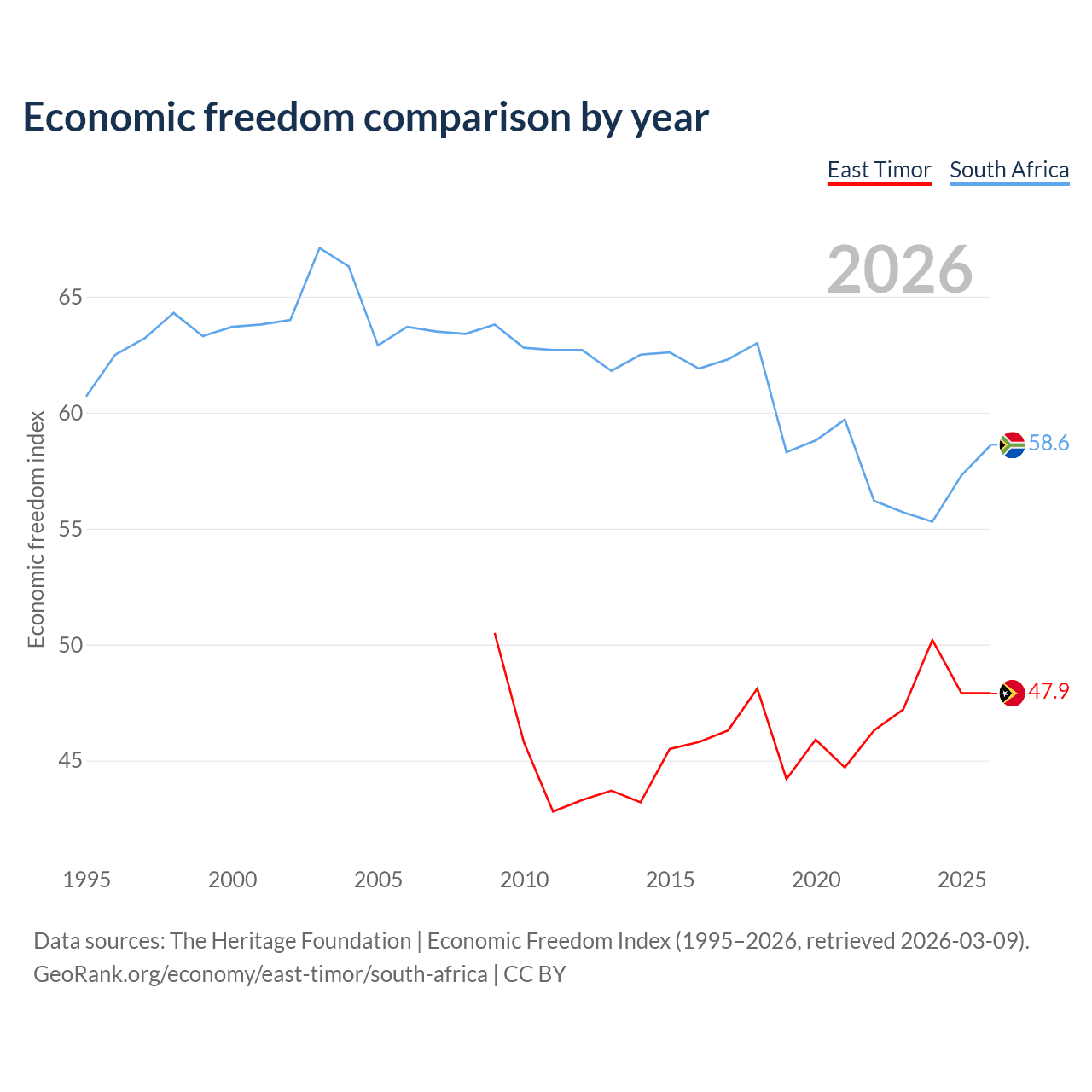 The Economic Freedom Index for East Timor is 47.9, ranking 173/197, compared to 58.6 for South Africa, ranking 110/197. The chart above displays a comparison of annual changes in economic freedom indexes.