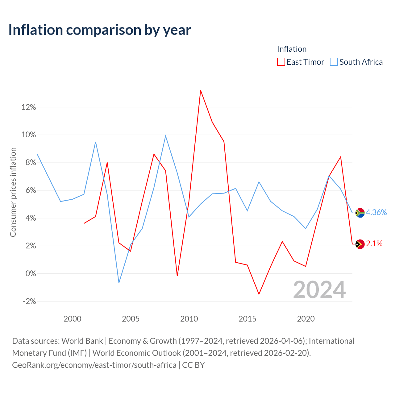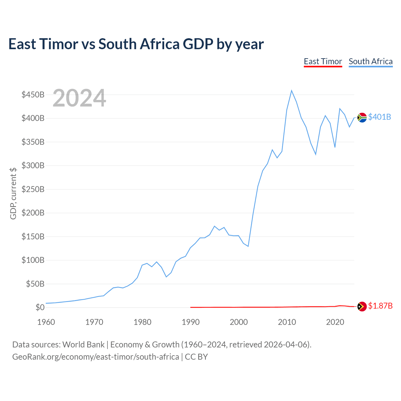 East Timor has a GDP of $1.87B compared to $401B for South Africa, ranking 181/197 and 40/197 by economy size, respectively.