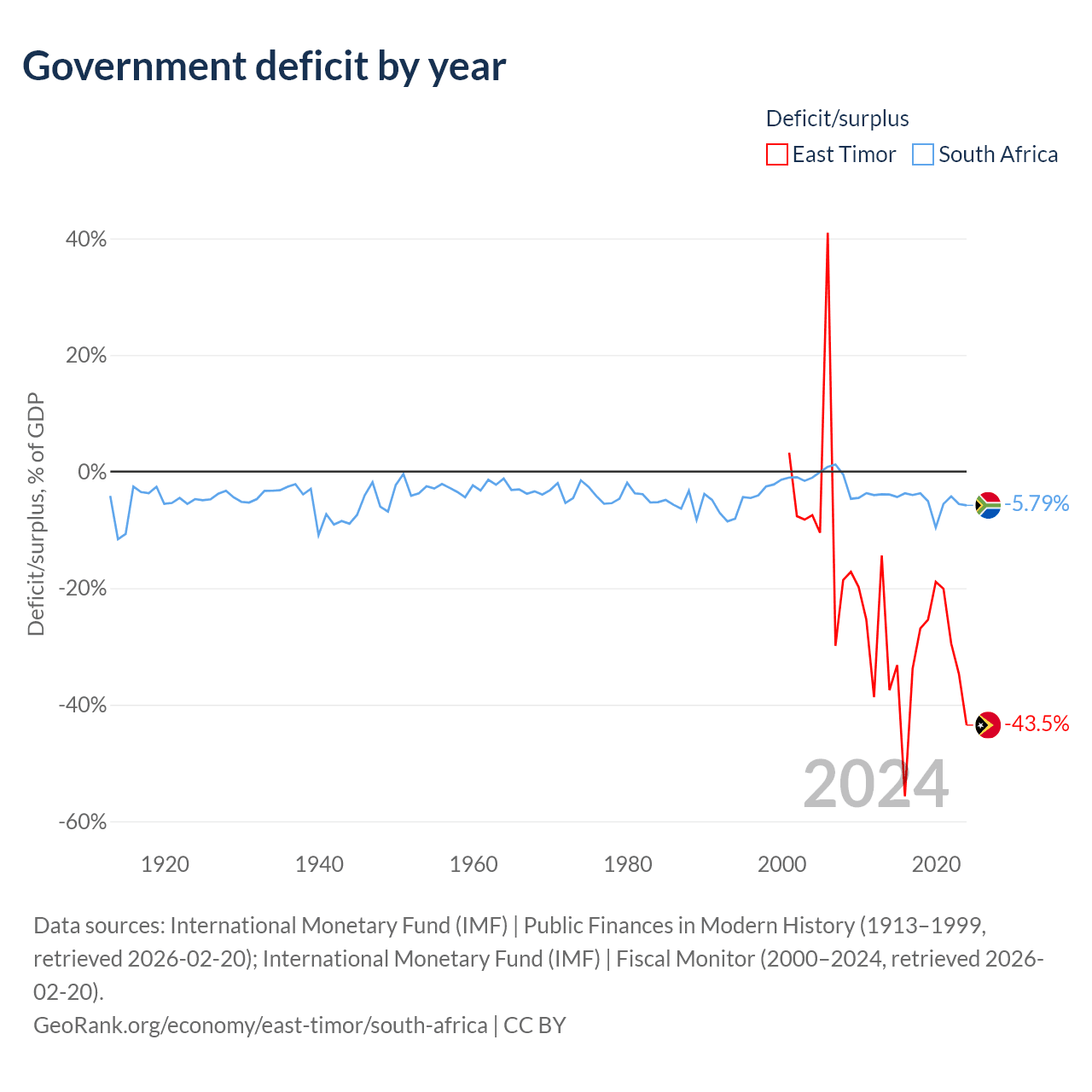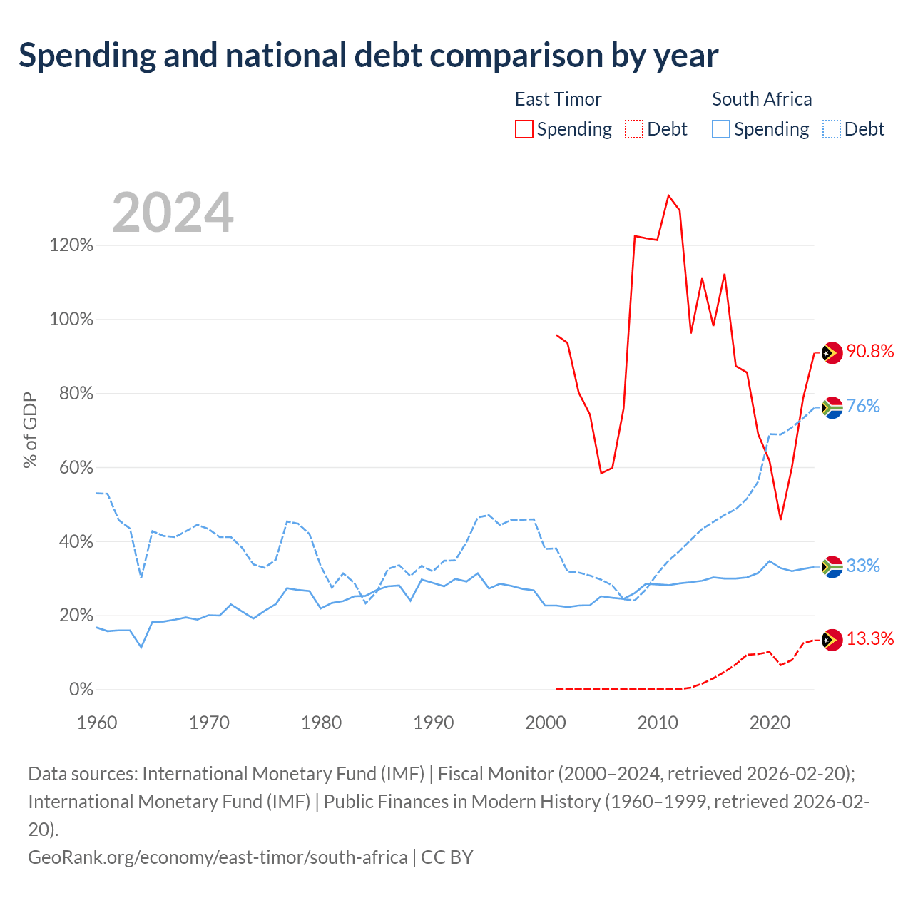 East Timor has $249M in government debt (13.3% of GDP), compared to $305B (76% of GDP) in South Africa.