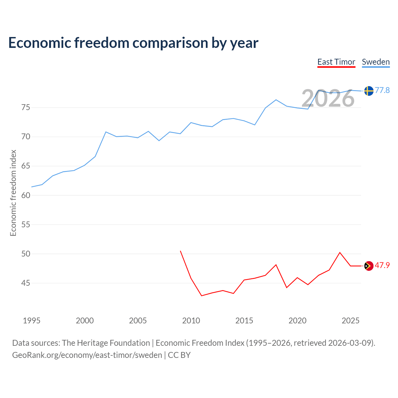 The Economic Freedom Index for East Timor is 47.9, ranking 173/197, compared to 77.8 for Sweden, ranking 14/197. The chart above displays a comparison of annual changes in economic freedom indexes.