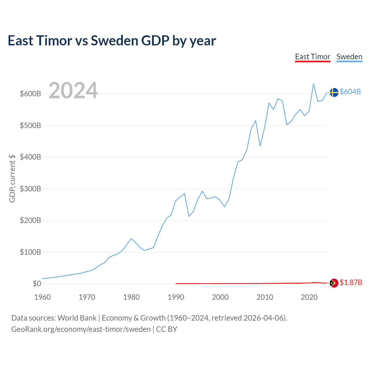 East Timor has a GDP of $1.87B compared to $604B for Sweden, ranking 181/197 and 26/197 by economy size, respectively.