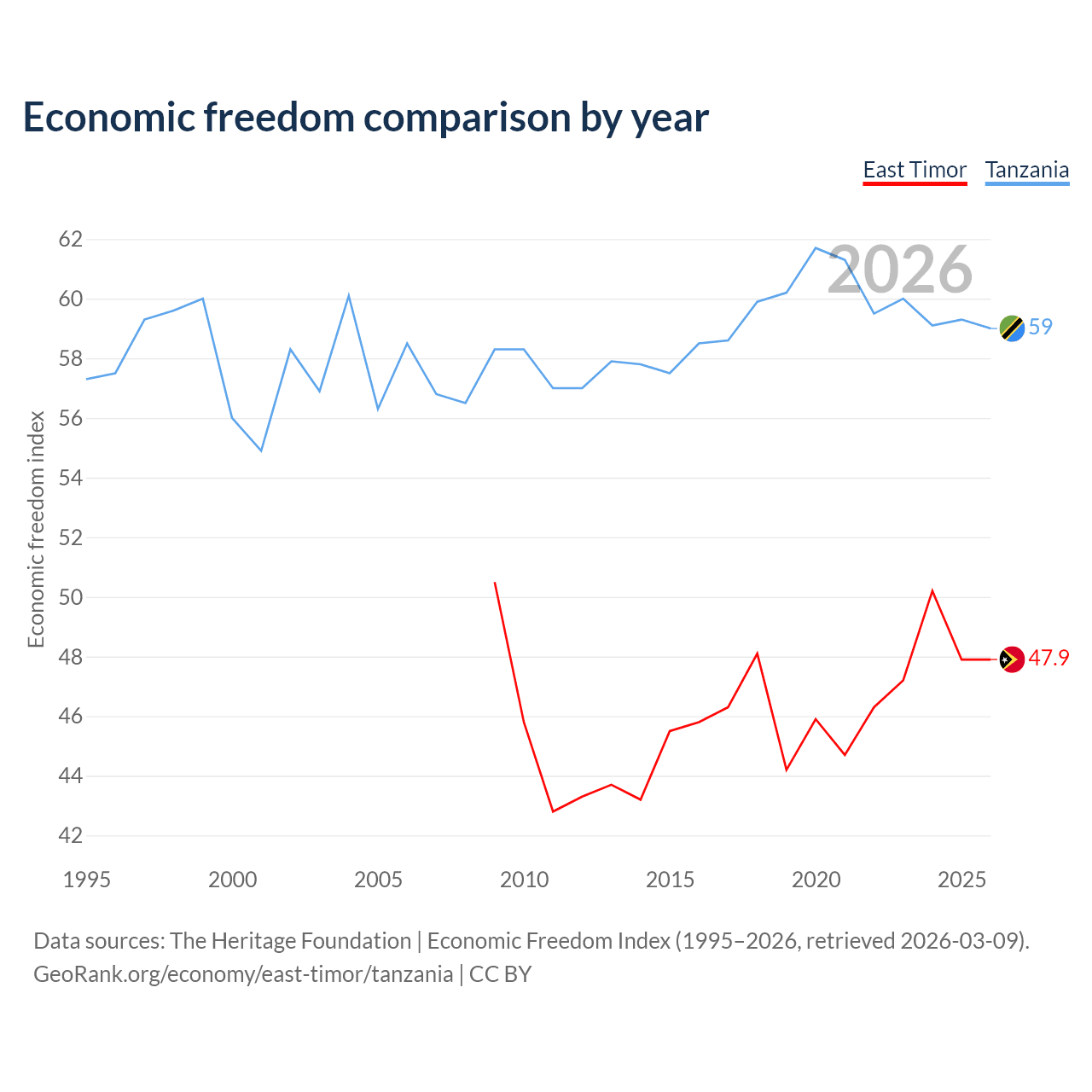 The Economic Freedom Index for East Timor is 47.9, ranking 173/197, compared to 59 for Tanzania, ranking 106/197. The chart above displays a comparison of annual changes in economic freedom indexes.