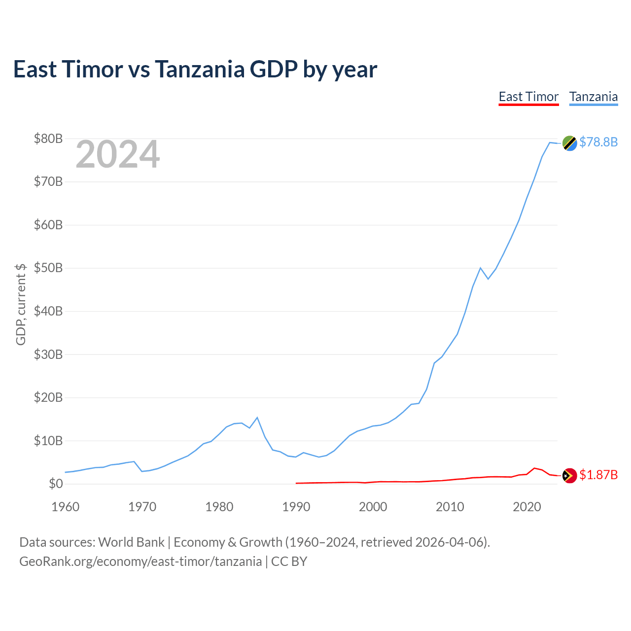 East Timor has a GDP of $1.87B compared to $78.8B for Tanzania, ranking 181/197 and 82/197 by economy size, respectively.