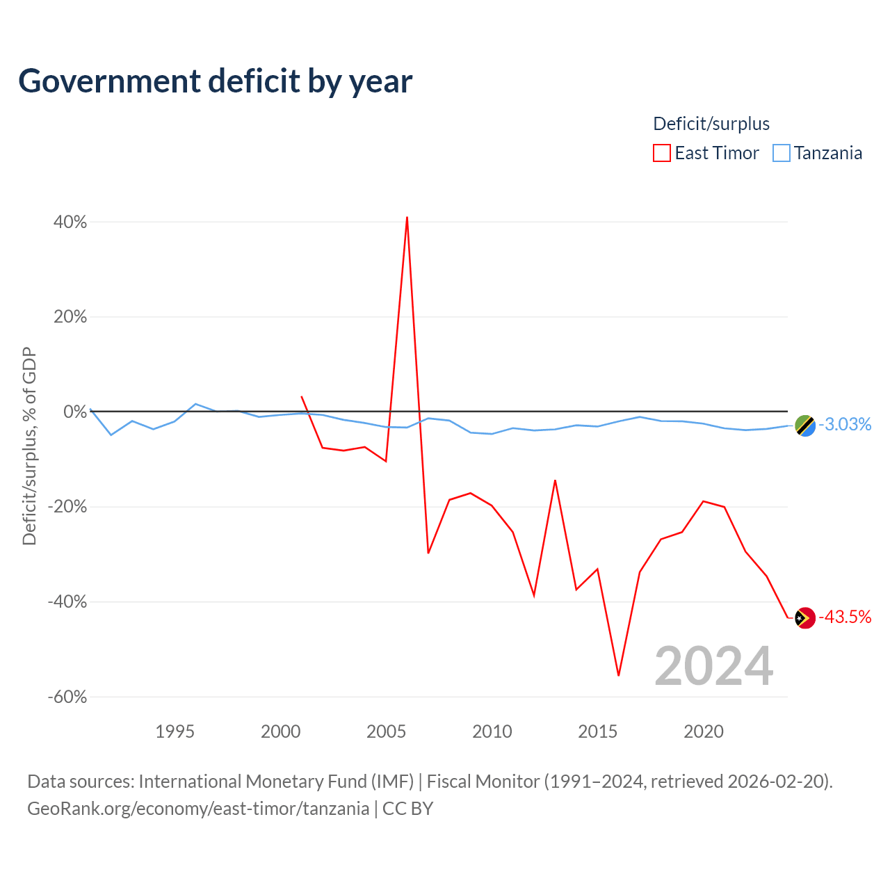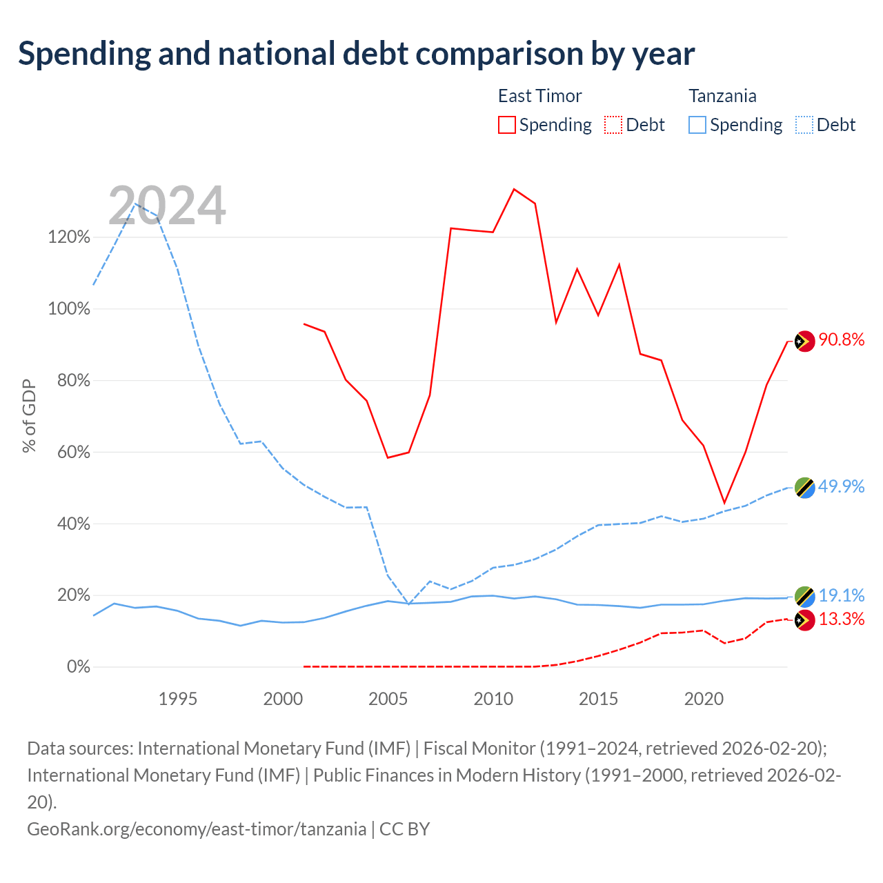 East Timor has $249M in government debt (13.3% of GDP), compared to $39.3B (49.9% of GDP) in Tanzania.