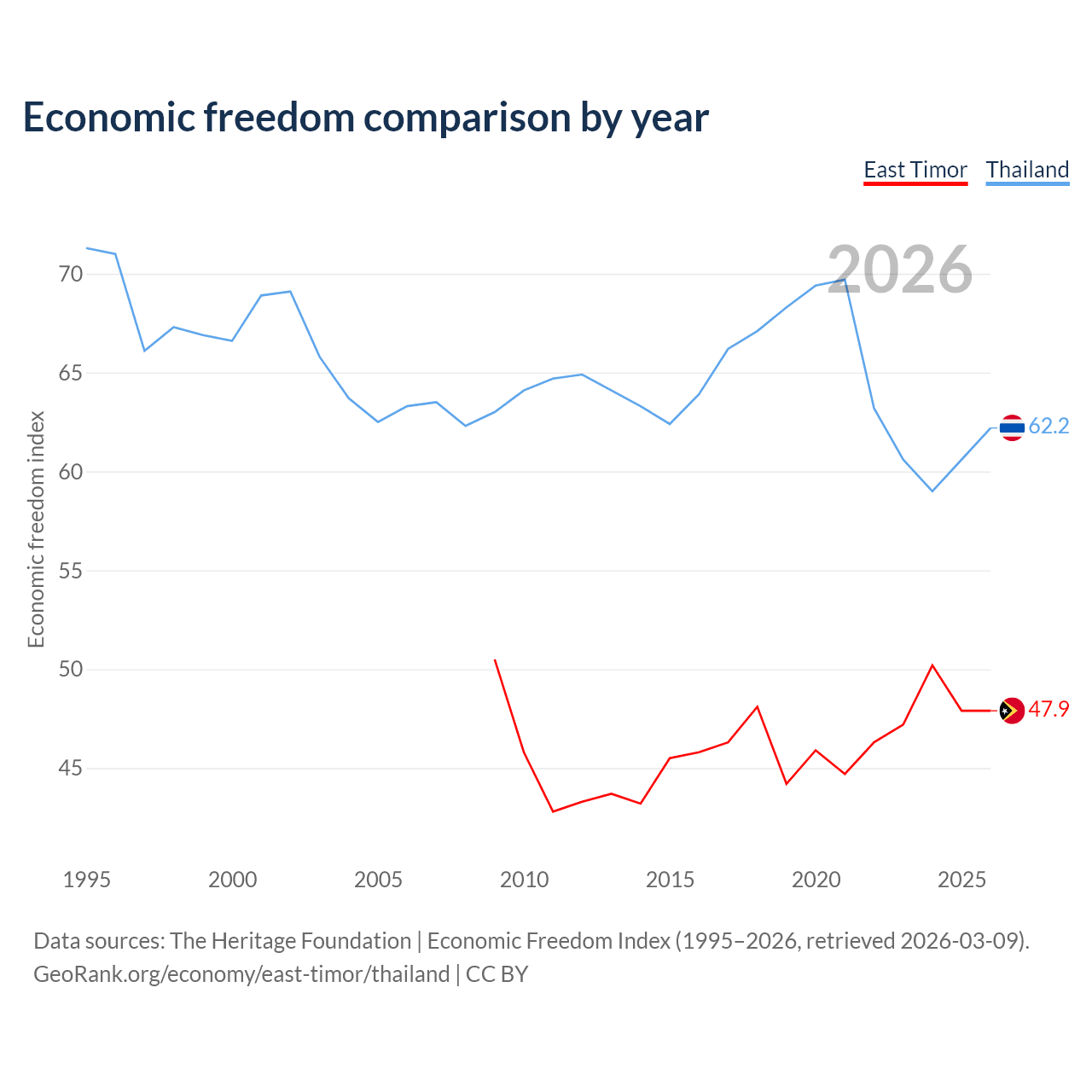 The Economic Freedom Index for East Timor is 47.9, ranking 173/197, compared to 62.2 for Thailand, ranking 88/197. The chart above displays a comparison of annual changes in economic freedom indexes.