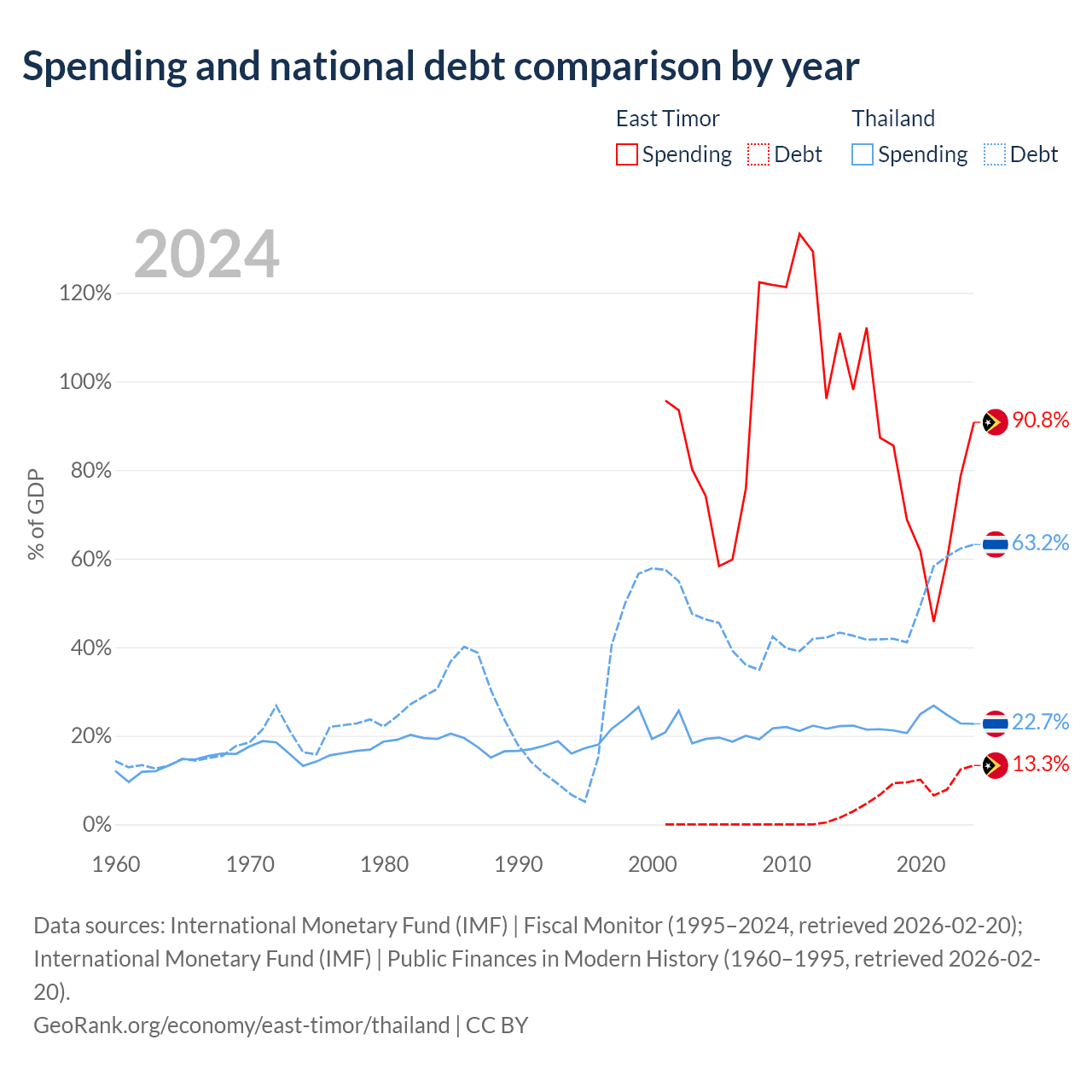 East Timor has $249M in government debt (13.3% of GDP), compared to $333B (63.2% of GDP) in Thailand.