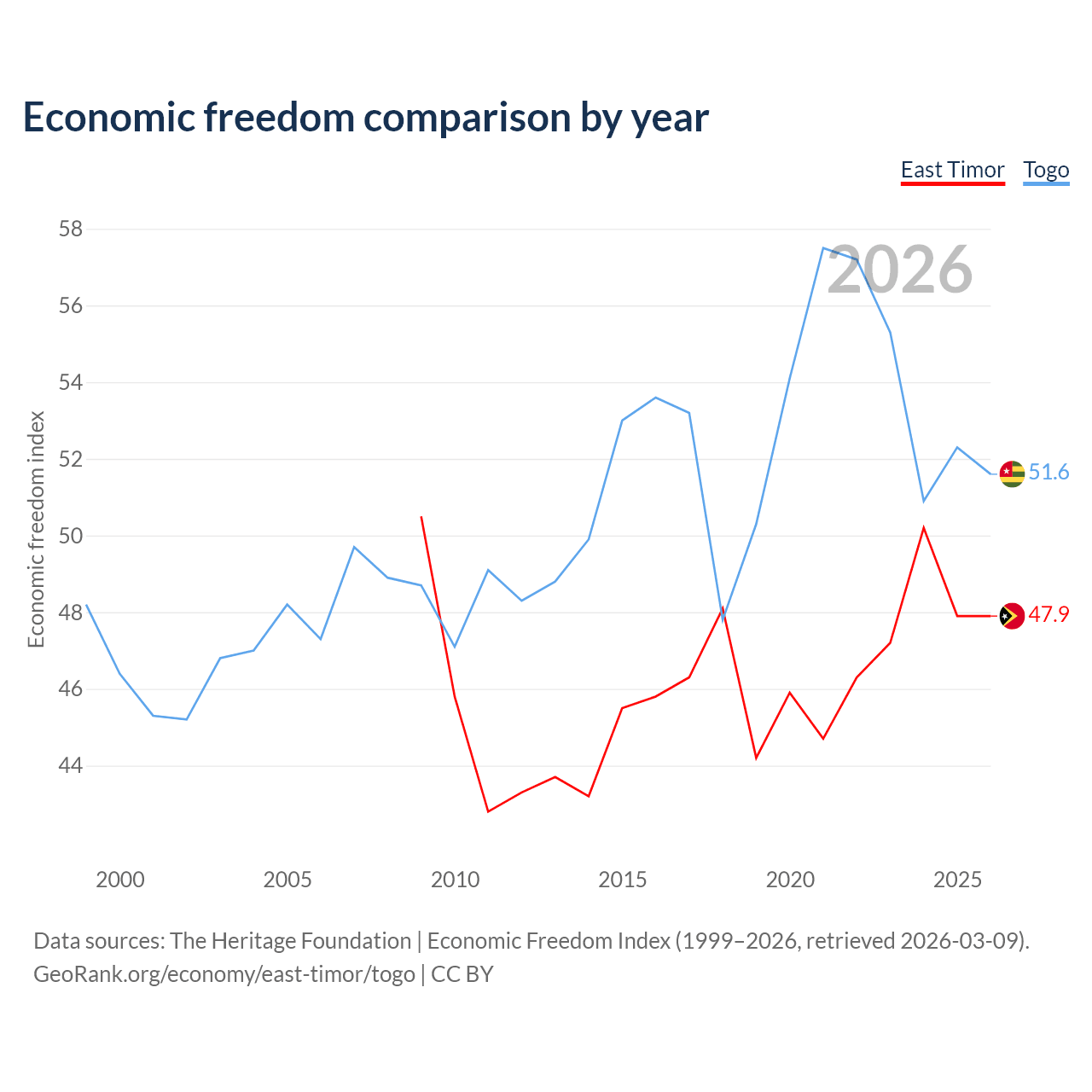 The Economic Freedom Index for East Timor is 47.9, ranking 173/197, compared to 51.6 for Togo, ranking 153/197. The chart above displays a comparison of annual changes in economic freedom indexes.