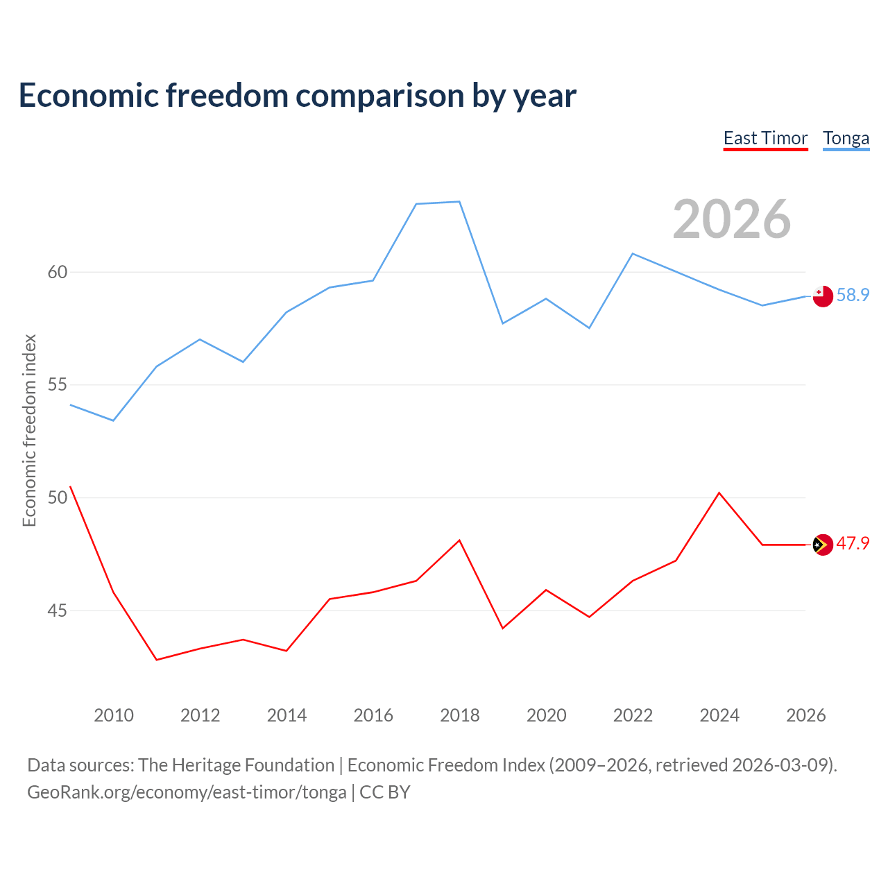 The Economic Freedom Index for East Timor is 47.9, ranking 173/197, compared to 58.9 for Tonga, ranking 107/197. The chart above displays a comparison of annual changes in economic freedom indexes.