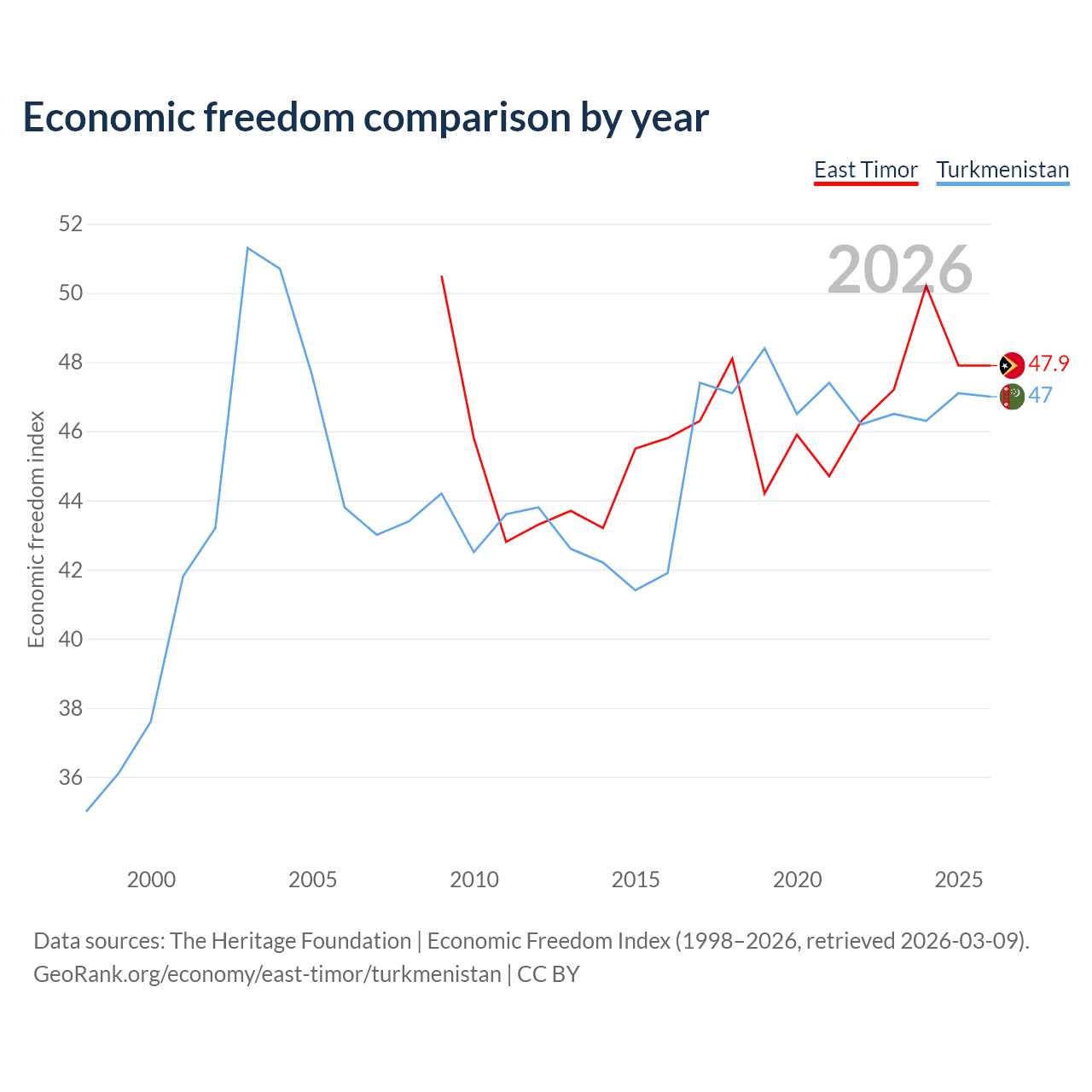 The Economic Freedom Index for East Timor is 47.9, ranking 173/197, compared to 47 for Turkmenistan, ranking 177/197. The chart above displays a comparison of annual changes in economic freedom indexes.