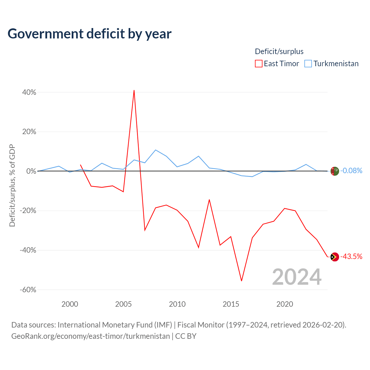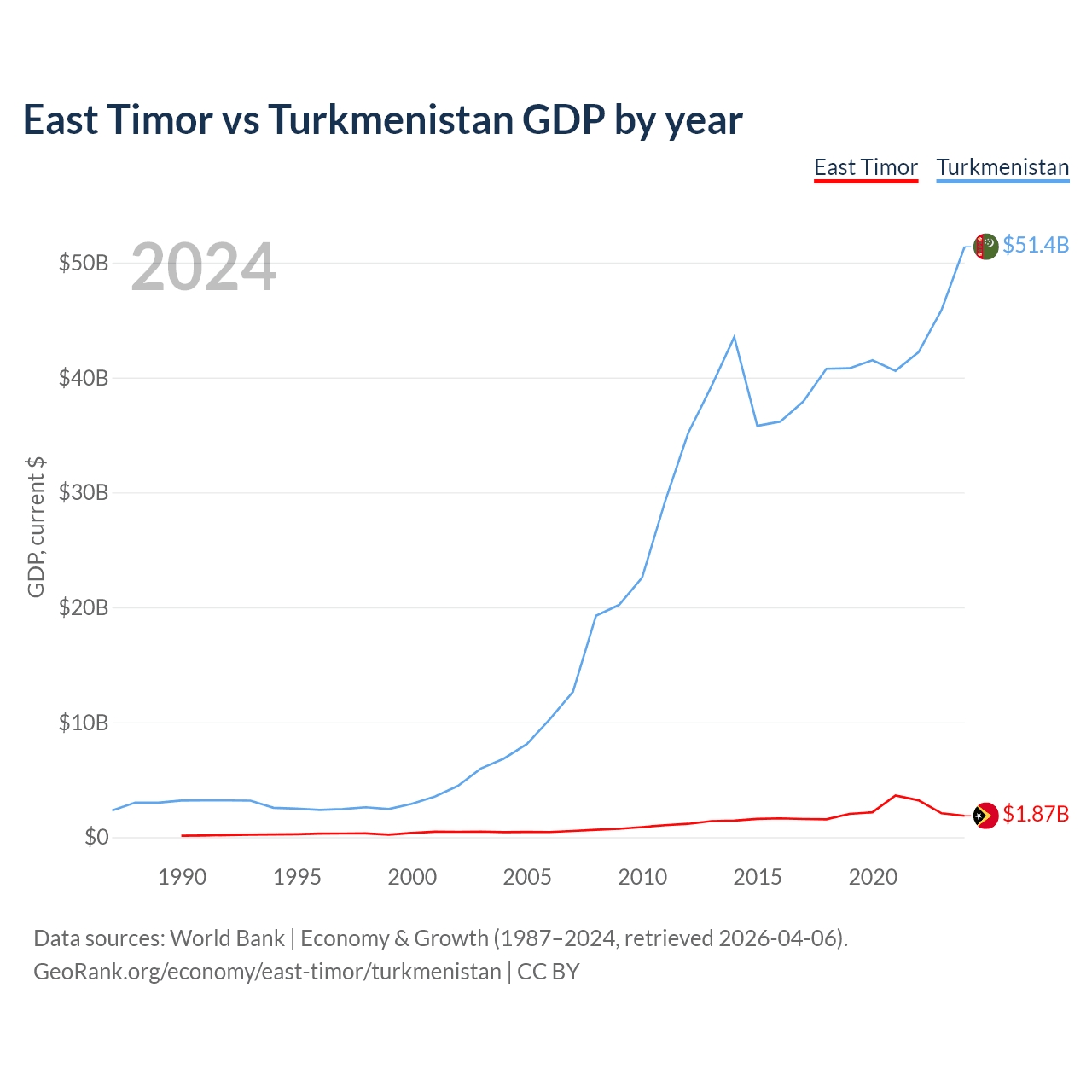 East Timor has a GDP of $1.87B compared to $51.4B for Turkmenistan, ranking 181/197 and 92/197 by economy size, respectively.
