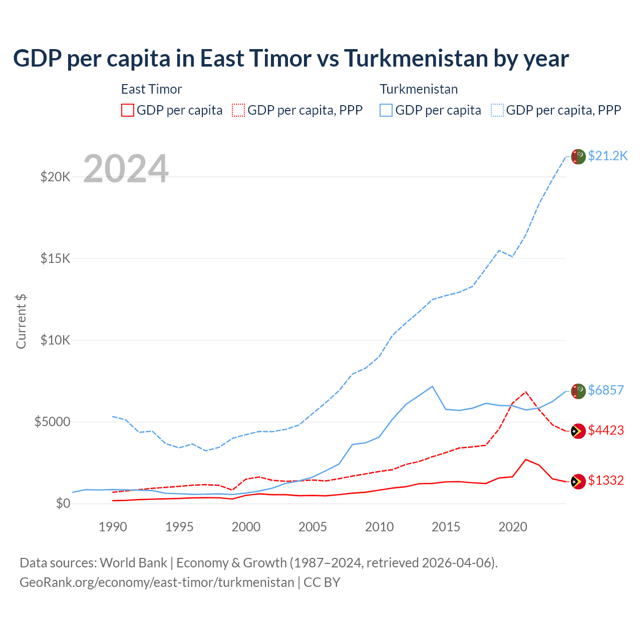 East Timor's GDP per capita is $1,332, ranking 167/197, compared to $6,857 in Turkmenistan, ranking 104/197. Adjusted for purchasing power (GDP per capita PPP), East Timor ranks 163rd at $4,423, while Turkmenistan ranks 94th at $21,213.