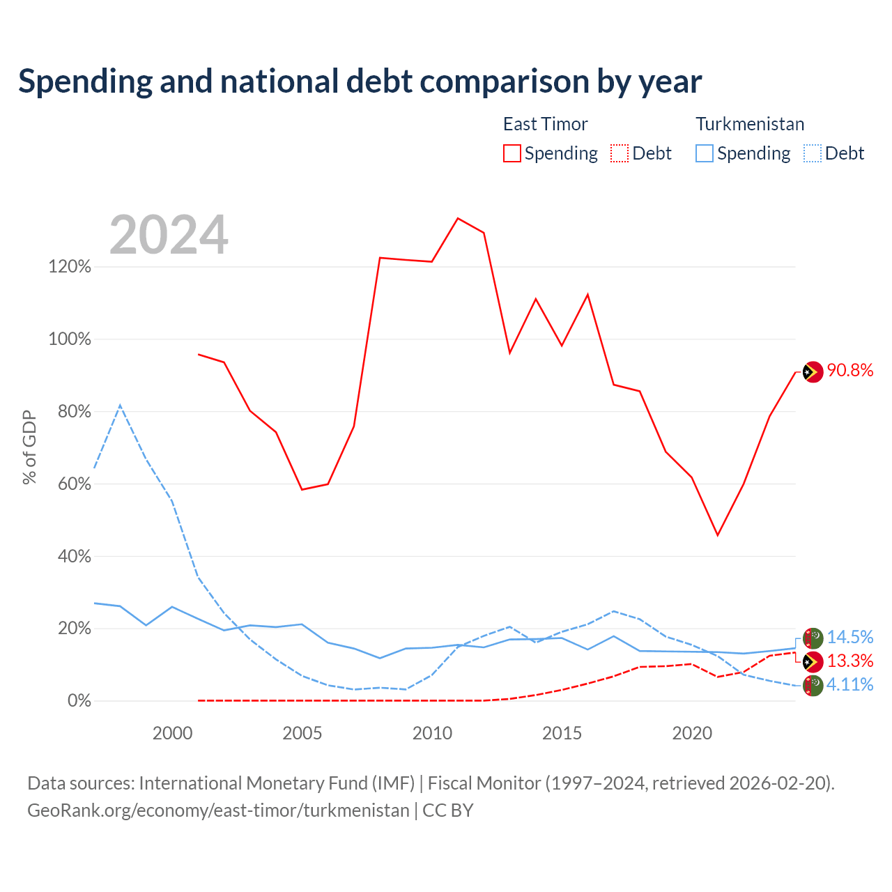 East Timor has $249M in government debt (13.3% of GDP), compared to $2.11B (4.11% of GDP) in Turkmenistan.