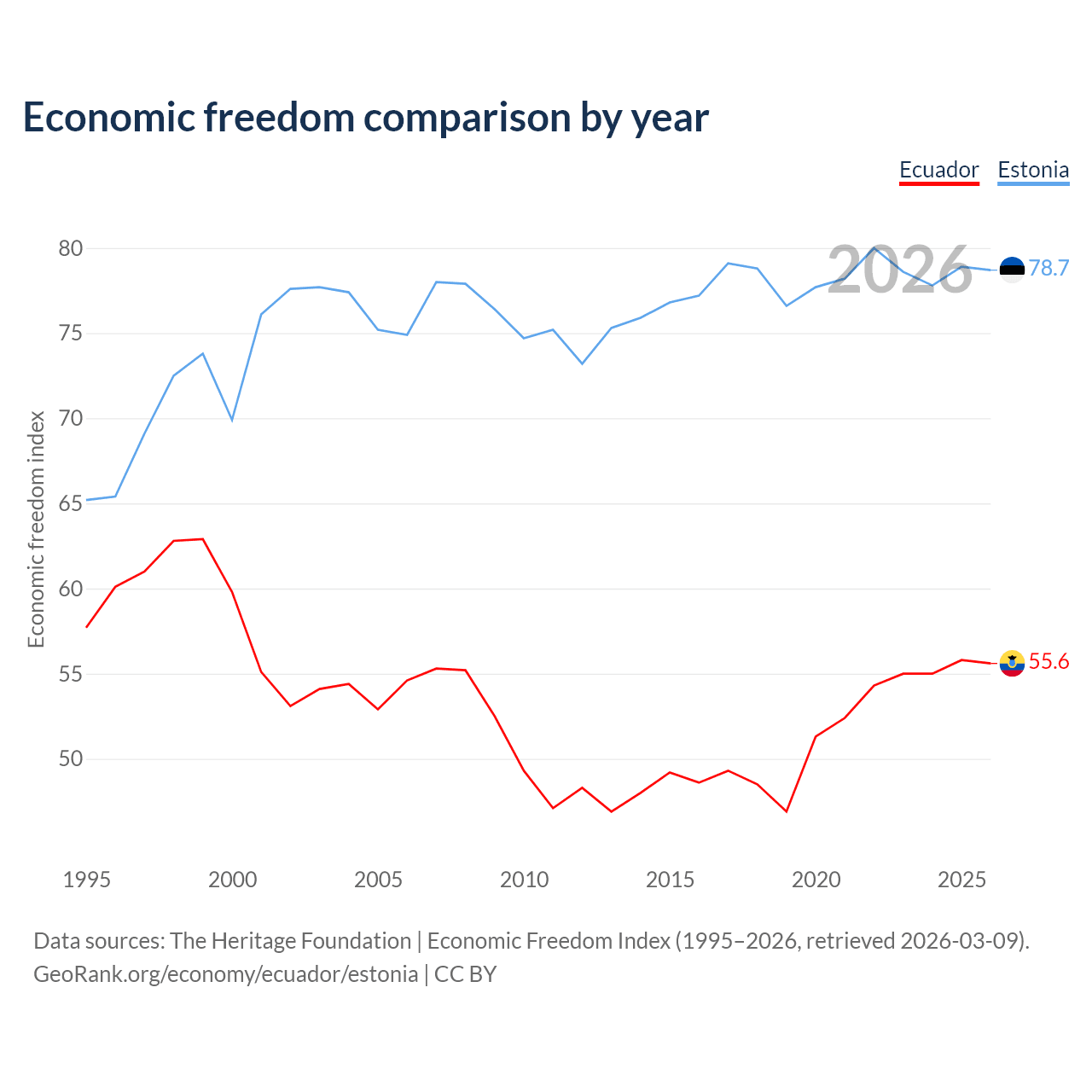 Data sources: The Heritage Foundation | Economic Freedom Index (1995–2026, retrieved 2026-03-09).