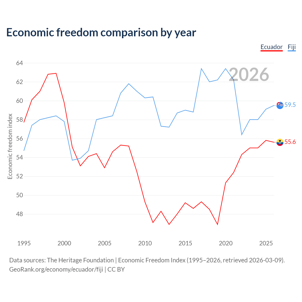 The Economic Freedom Index for Ecuador is 55.6, ranking 127/197, compared to 59.5 for Fiji, ranking 103/197. The chart above displays a comparison of annual changes in economic freedom indexes.