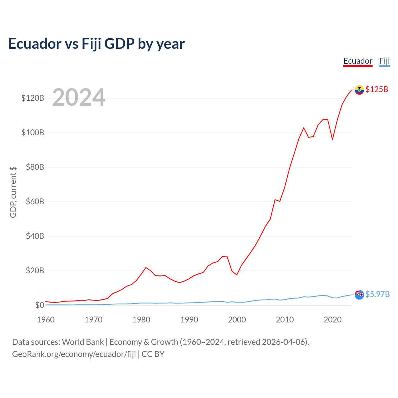Ecuador has a GDP of $125B compared to $5.97B for Fiji, ranking 62/197 and 161/197 by economy size, respectively.