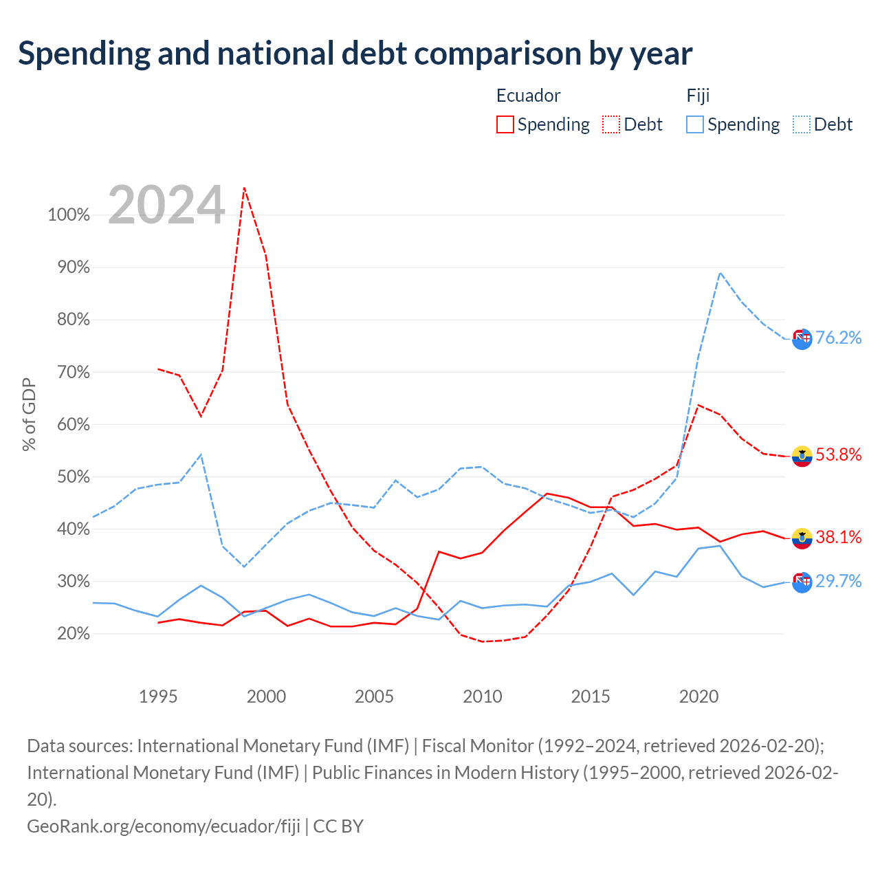 Ecuador has $67B in government debt (53.8% of GDP), compared to $4.54B (76.2% of GDP) in Fiji.