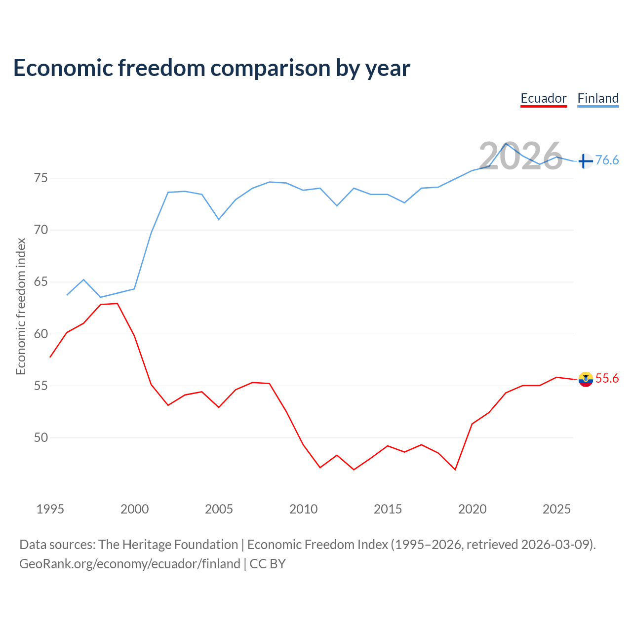The Economic Freedom Index for Ecuador is 55.6, ranking 127/197, compared to 76.6 for Finland, ranking 15/197. The chart above displays a comparison of annual changes in economic freedom indexes.