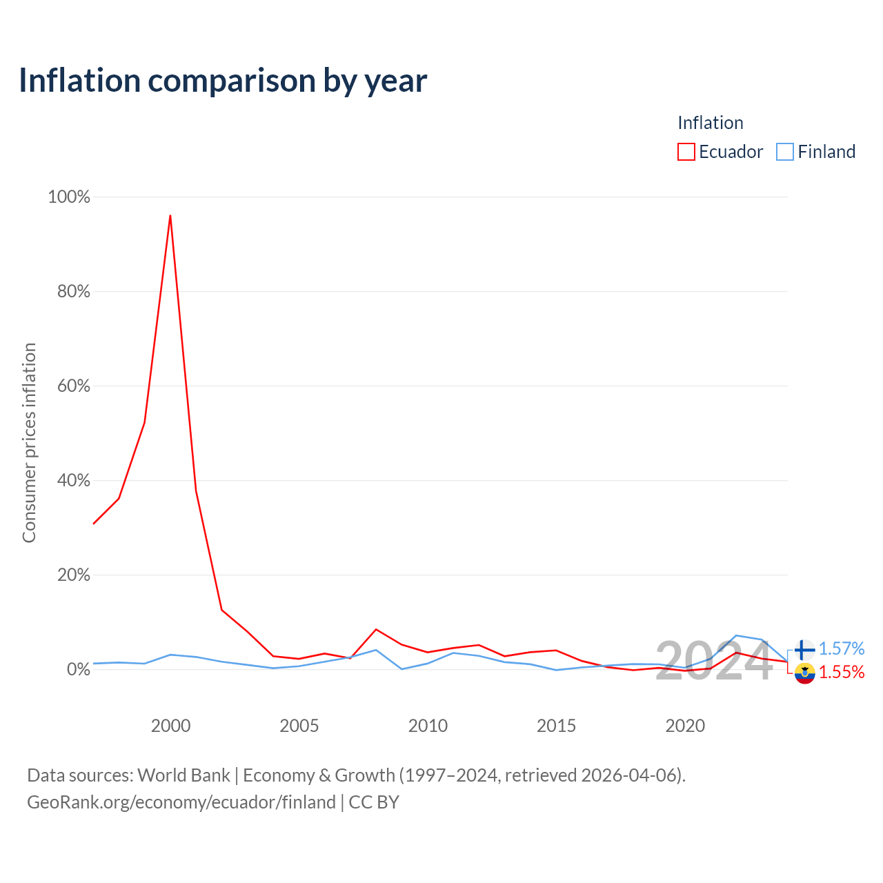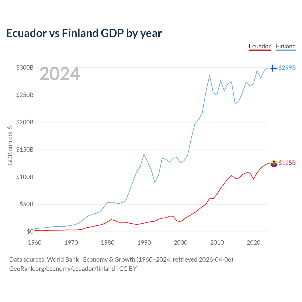 Ecuador has a GDP of $125B compared to $299B for Finland, ranking 62/197 and 47/197 by economy size, respectively.