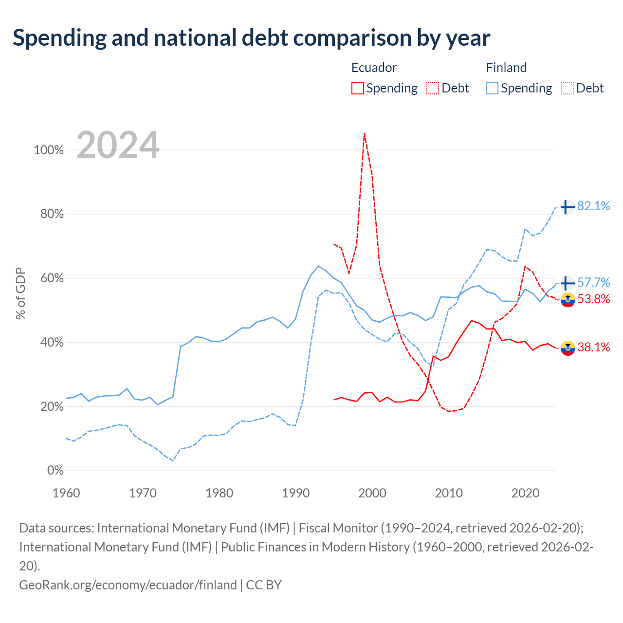 Ecuador has $67B in government debt (53.8% of GDP), compared to $245B (82.1% of GDP) in Finland.