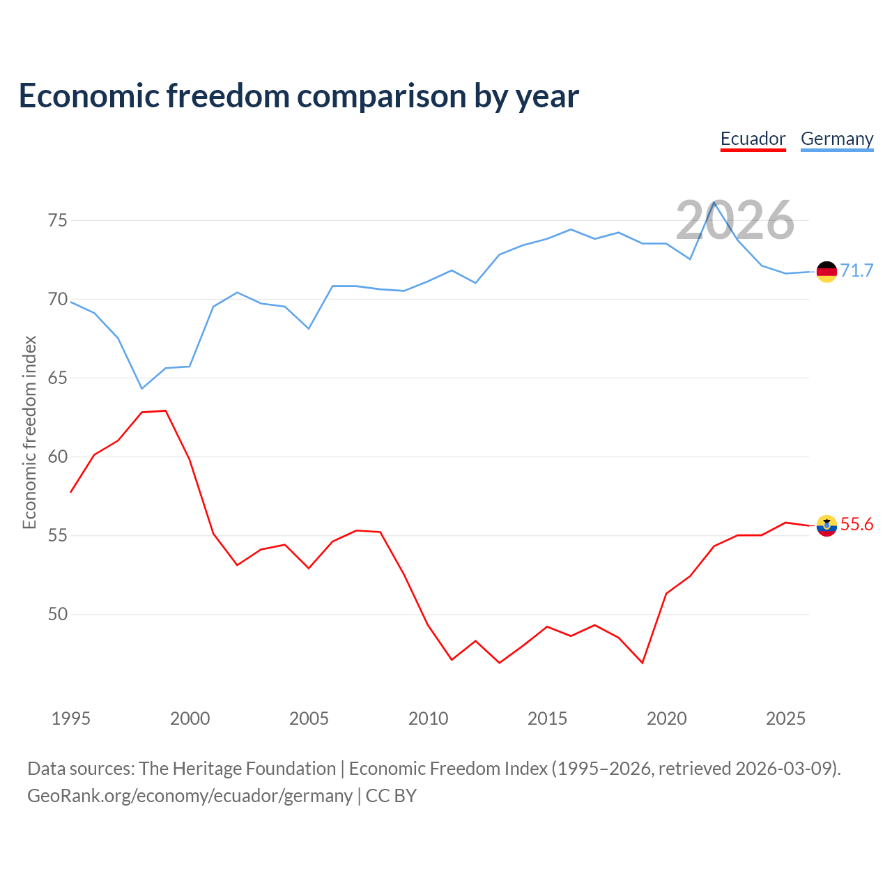 The Economic Freedom Index for Ecuador is 55.6, ranking 127/197, compared to 71.7 for Germany, ranking 30/197. The chart above displays a comparison of annual changes in economic freedom indexes.