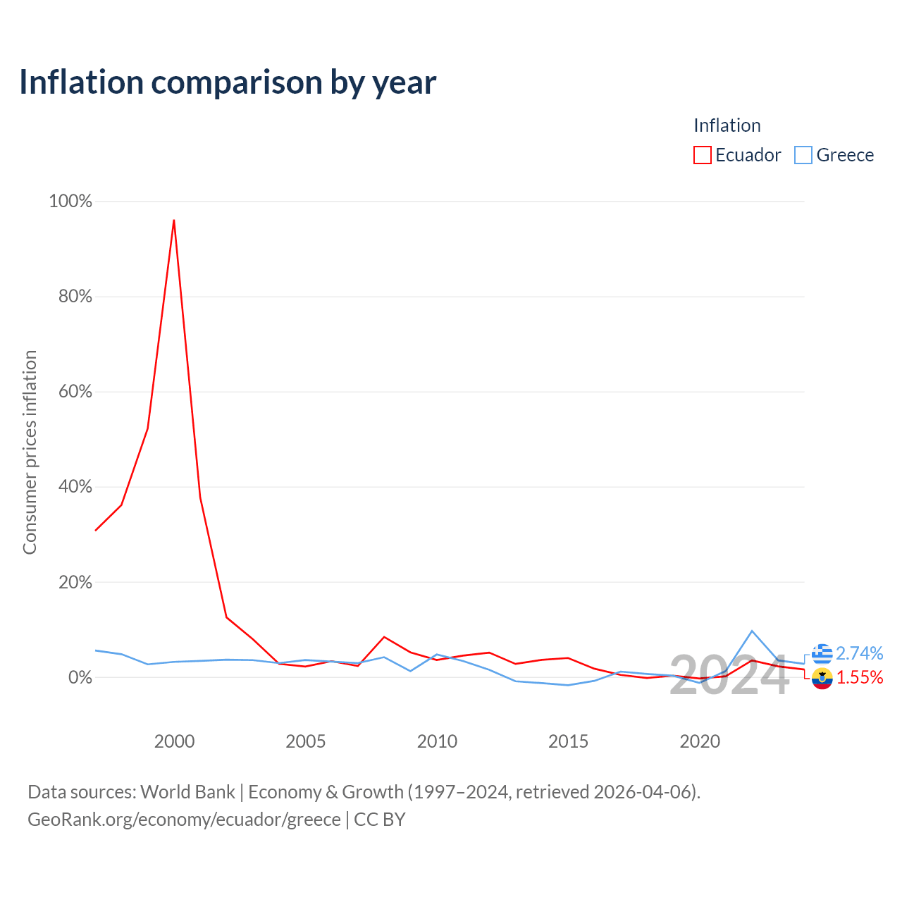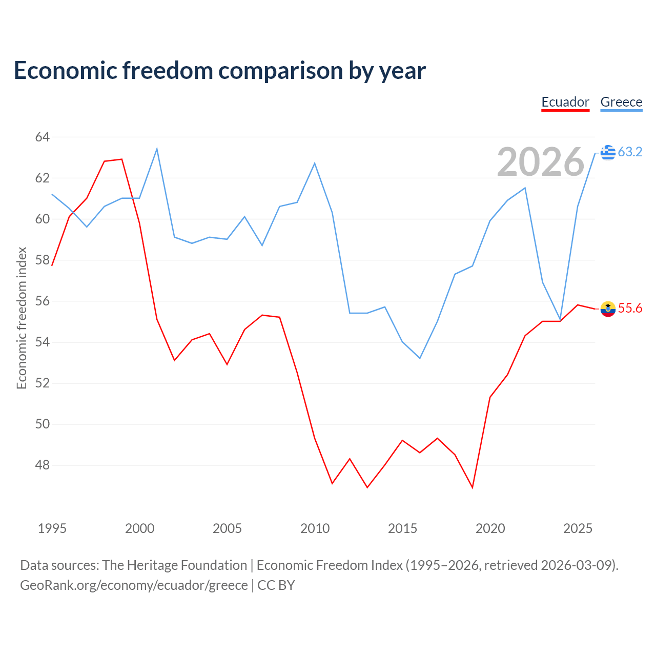The Economic Freedom Index for Ecuador is 55.6, ranking 127/197, compared to 63.2 for Greece, ranking 82/197. The chart above displays a comparison of annual changes in economic freedom indexes.
