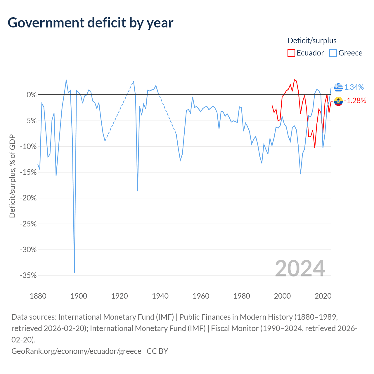 Ecuador has a GDP of $125B compared to $256B for Greece, ranking 62/197 and 53/197 by economy size, respectively.