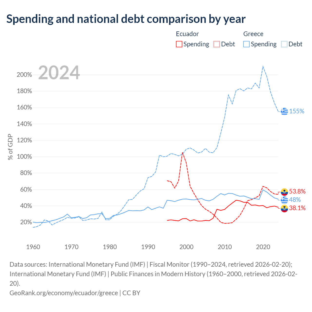 Ecuador has $67B in government debt (53.8% of GDP), compared to $397B (154.8% of GDP) in Greece.