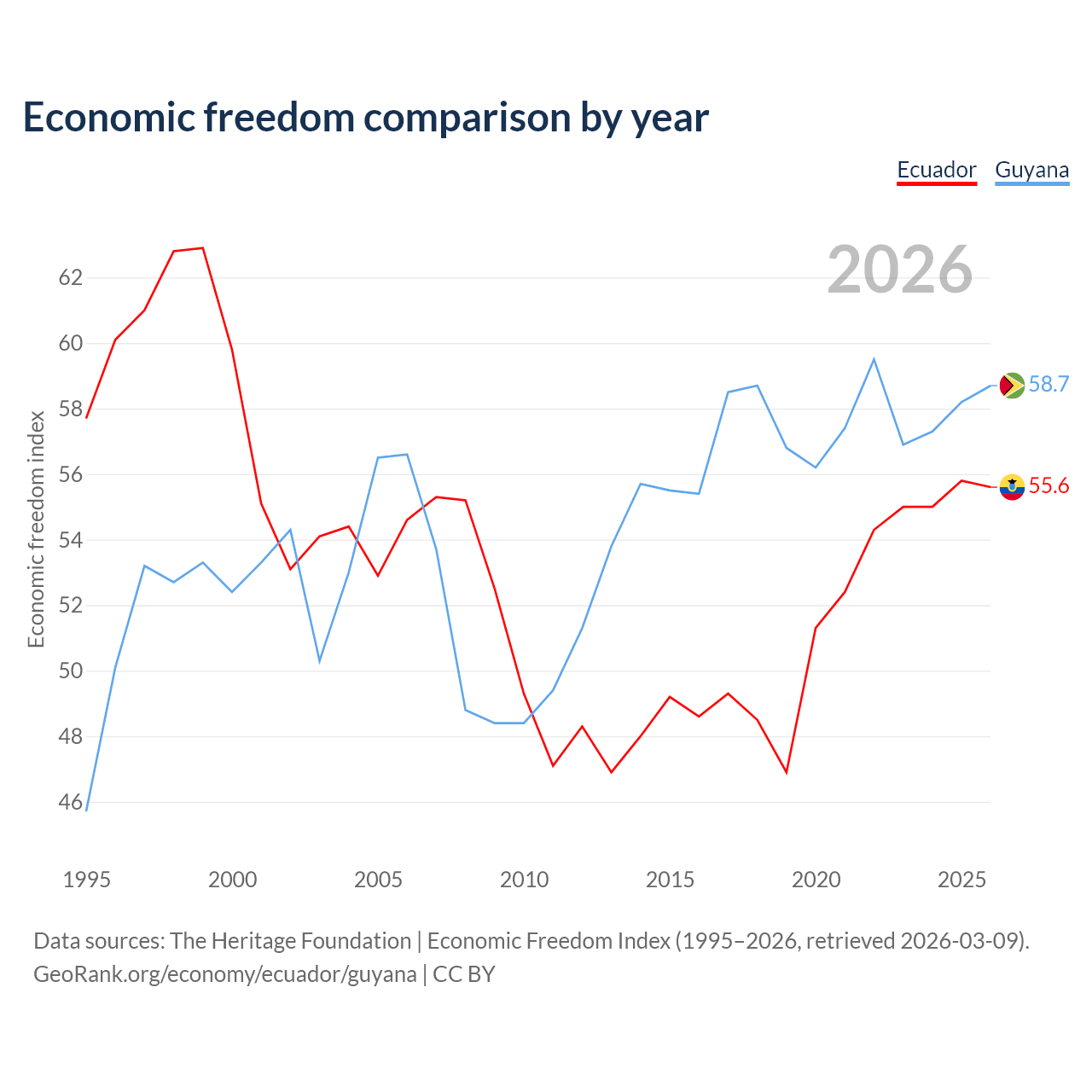 The Economic Freedom Index for Ecuador is 55.6, ranking 127/197, compared to 58.7 for Guyana, ranking 109/197. The chart above displays a comparison of annual changes in economic freedom indexes.