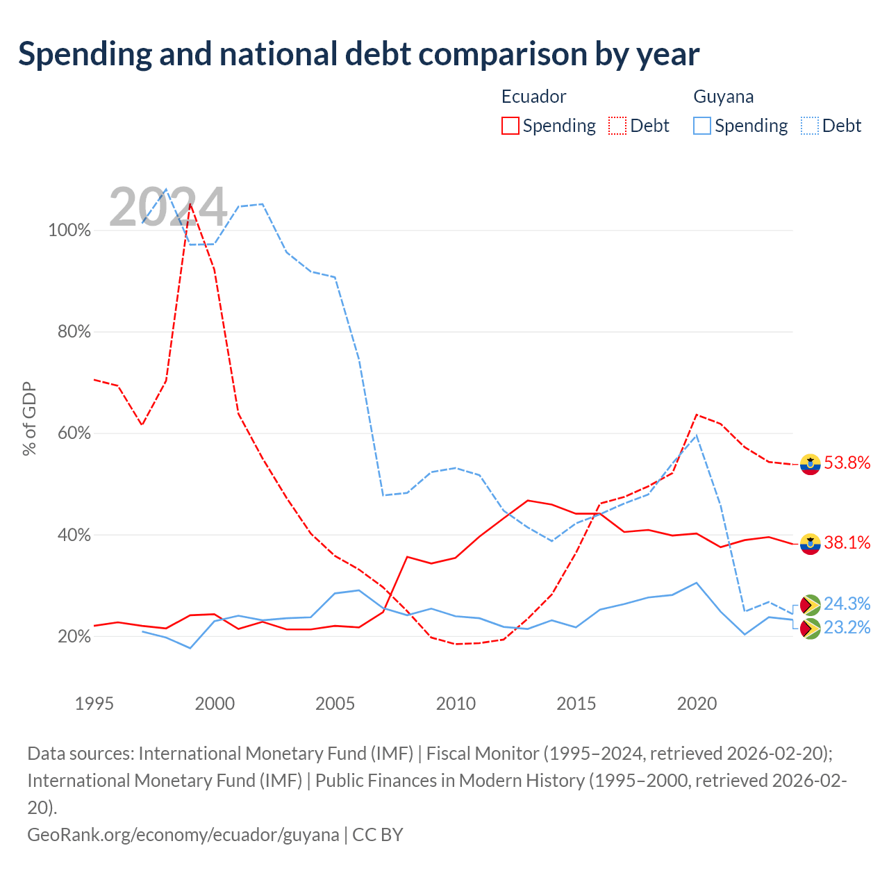 Ecuador has $67B in government debt (53.8% of GDP), compared to $5.99B (24.3% of GDP) in Guyana.