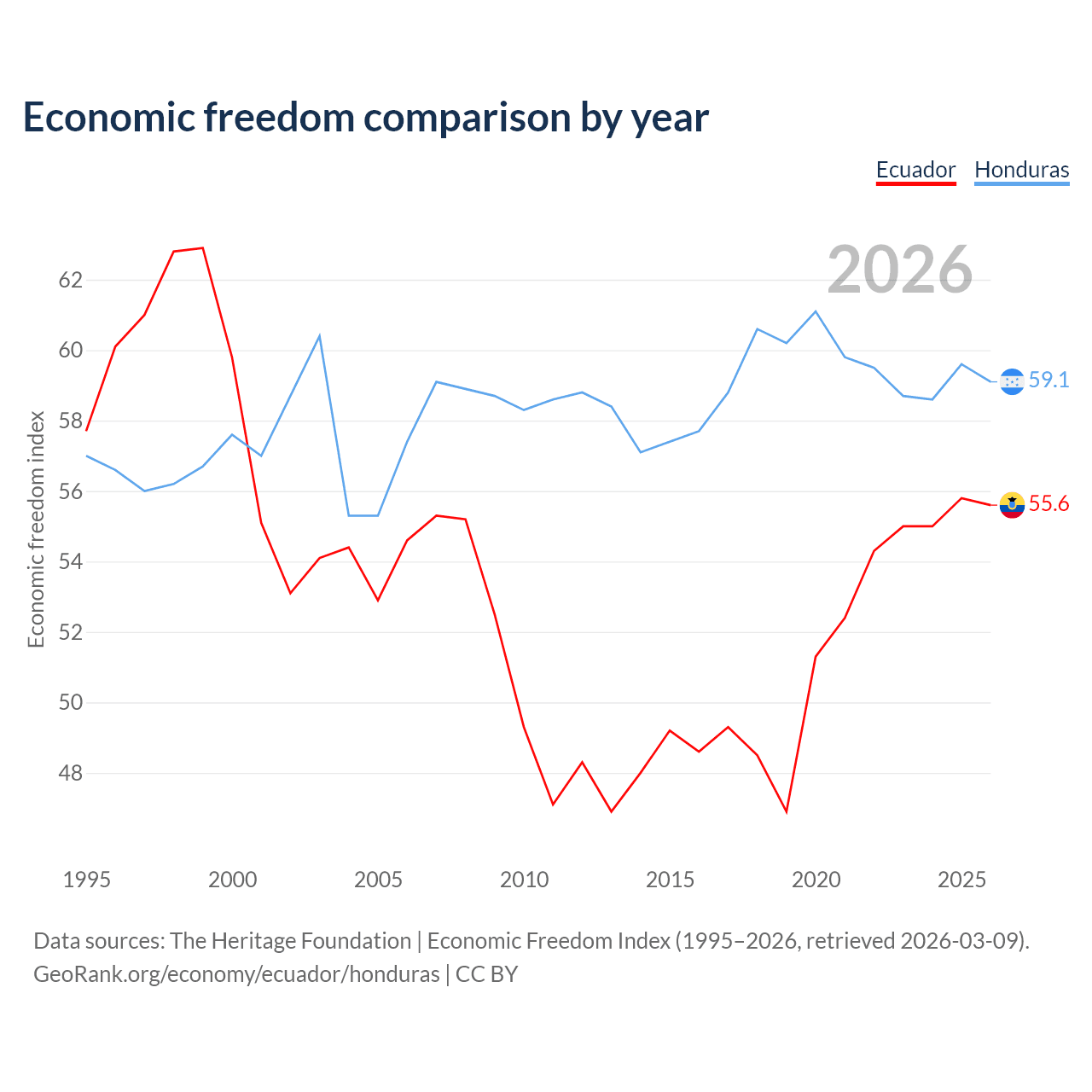Data sources: The Heritage Foundation | Economic Freedom Index (1995–2026, retrieved 2026-03-09).