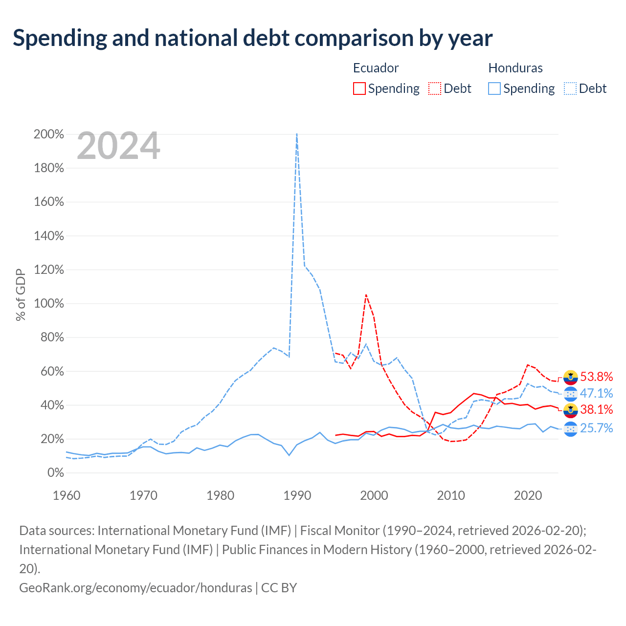 Ecuador has $67B in government debt (53.8% of GDP), compared to $17.5B (47.1% of GDP) in Honduras.
