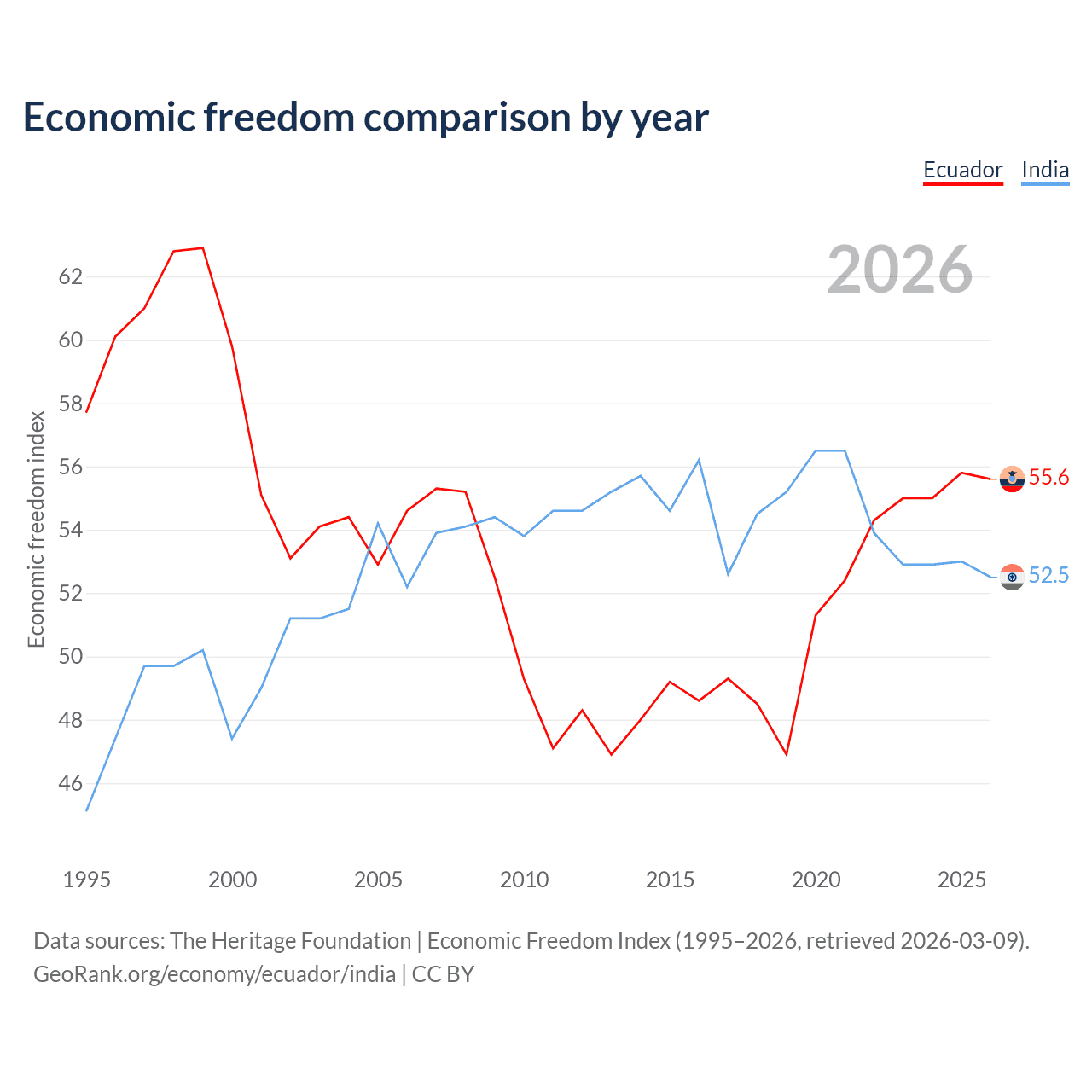 The Economic Freedom Index for Ecuador is 55.6, ranking 127/197, compared to 52.5 for India, ranking 146/197. The chart above displays a comparison of annual changes in economic freedom indexes.