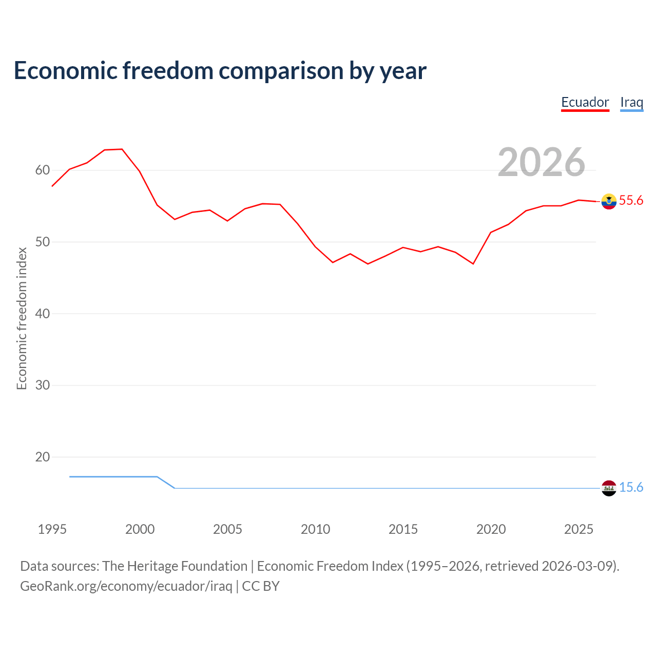 The Economic Freedom Index for Ecuador is 55.6, ranking 127/197, compared to 15.6 for Iraq, ranking 196/197. The chart above displays a comparison of annual changes in economic freedom indexes.