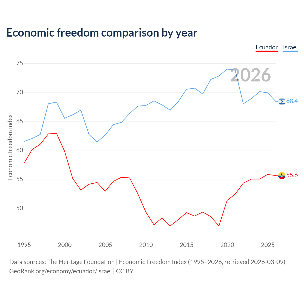 The Economic Freedom Index for Ecuador is 55.6, ranking 127/197, compared to 68.4 for Israel, ranking 47/197. The chart above displays a comparison of annual changes in economic freedom indexes.