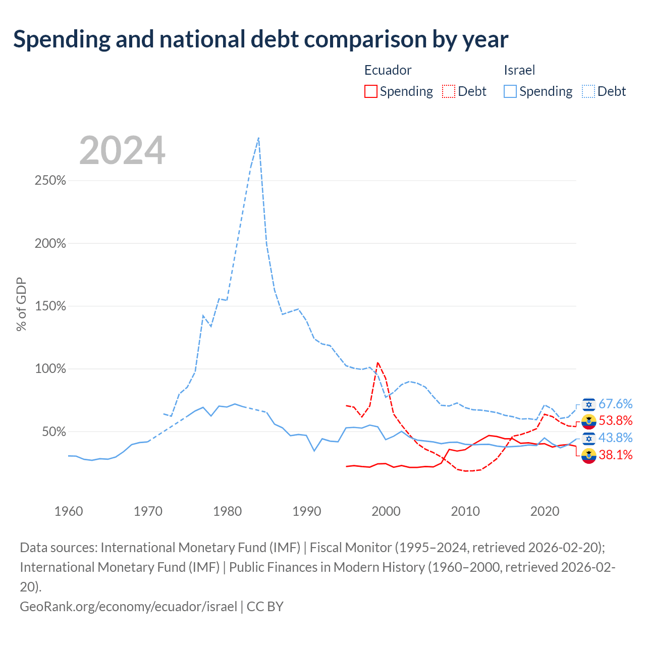 Ecuador has $67B in government debt (53.8% of GDP), compared to $366B (67.6% of GDP) in Israel.