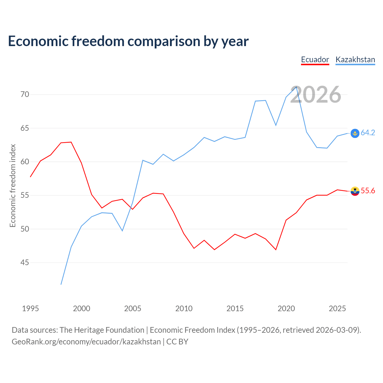 The Economic Freedom Index for Ecuador is 55.6, ranking 127/197, compared to 64.2 for Kazakhstan, ranking 75/197. The chart above displays a comparison of annual changes in economic freedom indexes.