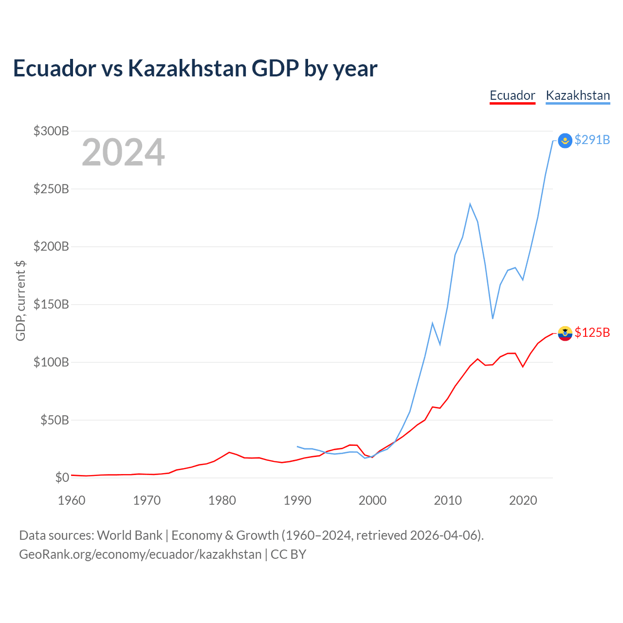 Ecuador has a GDP of $125B compared to $291B for Kazakhstan, ranking 62/197 and 48/197 by economy size, respectively.