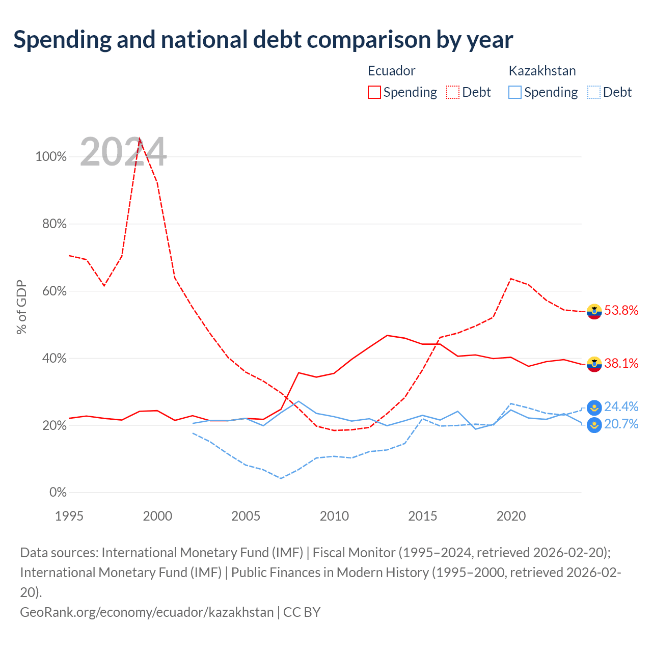 Ecuador has $67B in government debt (53.8% of GDP), compared to $71.1B (24.4% of GDP) in Kazakhstan.