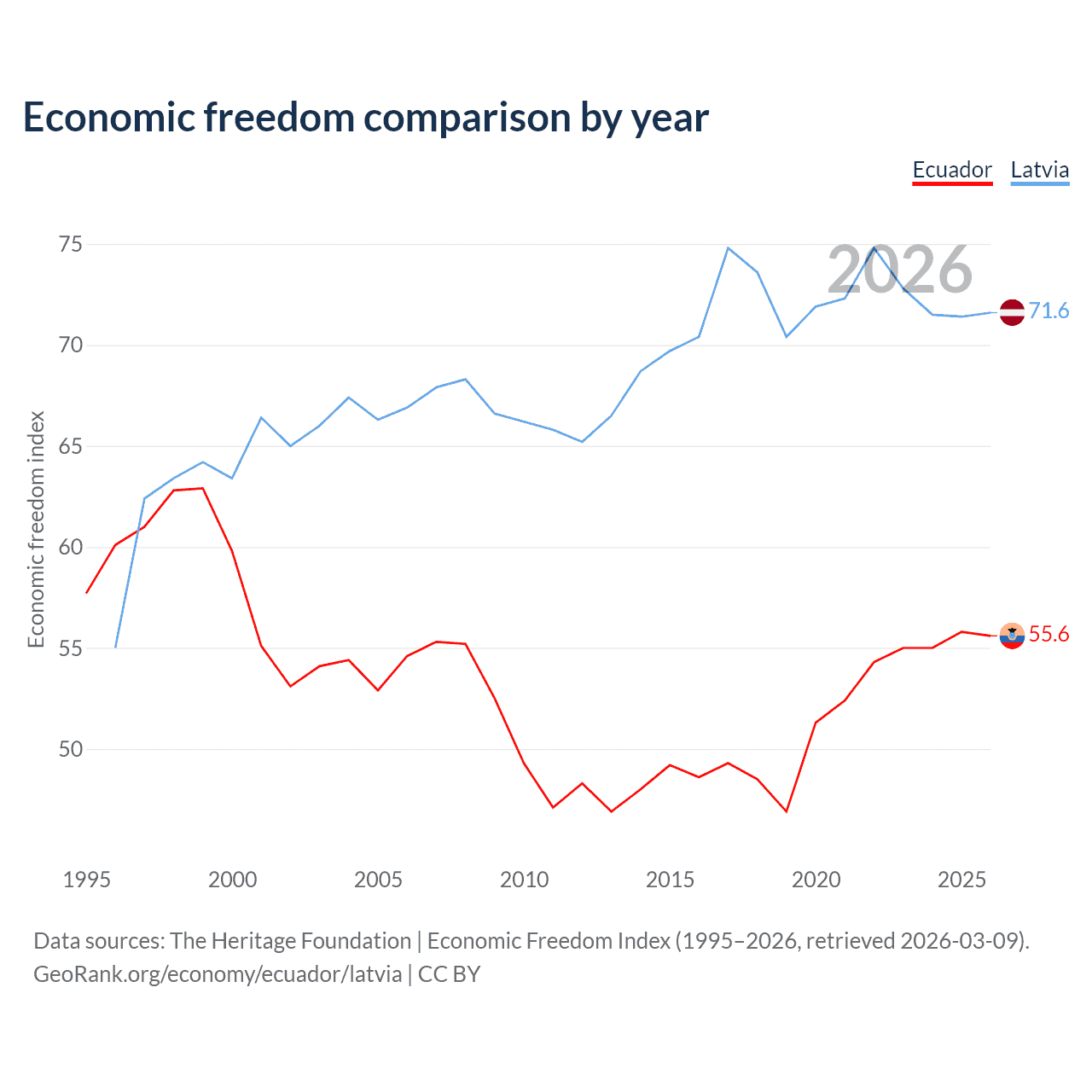 The Economic Freedom Index for Ecuador is 55.6, ranking 127/197, compared to 71.6 for Latvia, ranking 31/197. The chart above displays a comparison of annual changes in economic freedom indexes.