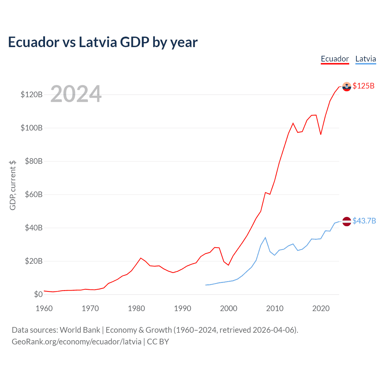 Ecuador has a GDP of $125B compared to $43.7B for Latvia, ranking 62/197 and 99/197 by economy size, respectively.