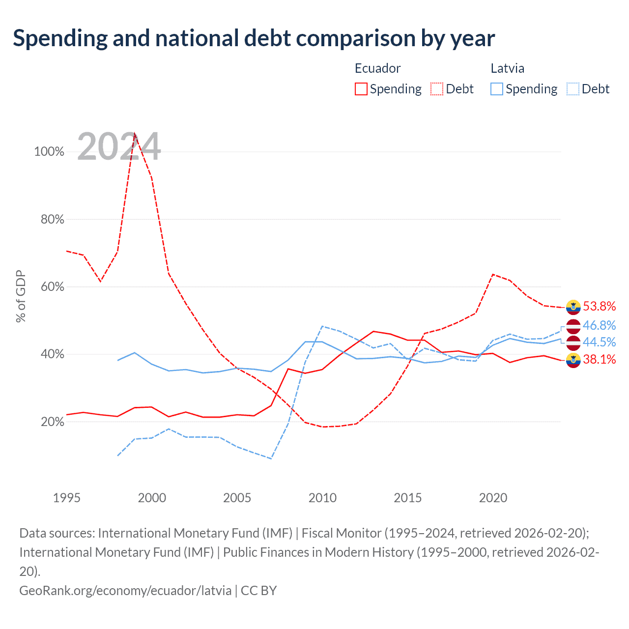 Ecuador has $67B in government debt (53.8% of GDP), compared to $20.4B (46.8% of GDP) in Latvia.