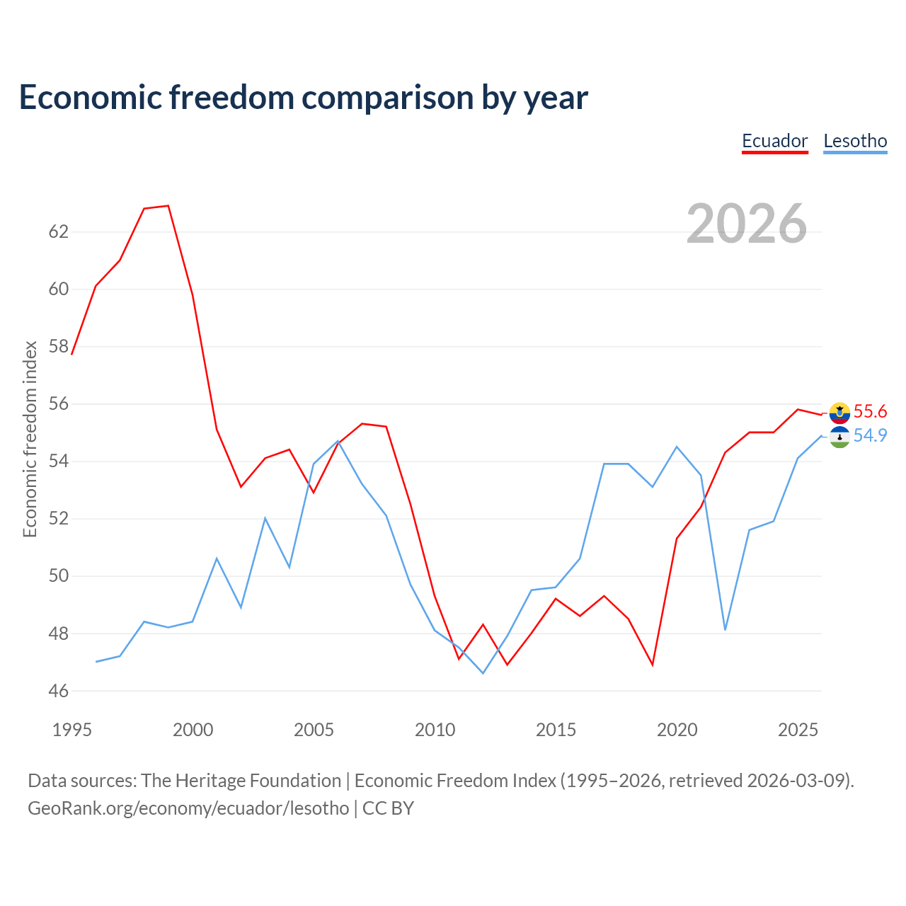 The Economic Freedom Index for Ecuador is 55.6, ranking 127/197, compared to 54.9 for Lesotho, ranking 130/197. The chart above displays a comparison of annual changes in economic freedom indexes.