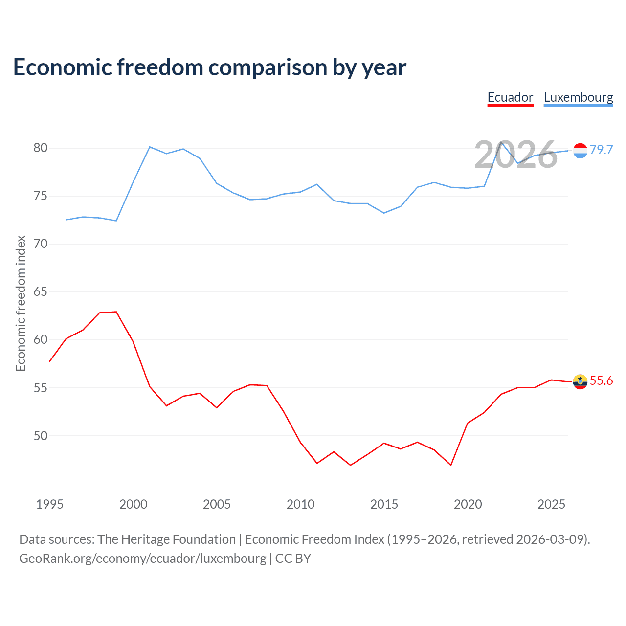 The Economic Freedom Index for Ecuador is 55.6, ranking 127/197, compared to 79.7 for Luxembourg, ranking 7/197. The chart above displays a comparison of annual changes in economic freedom indexes.