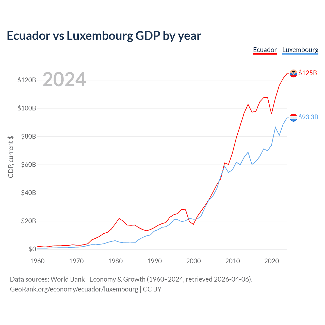 Ecuador has a GDP of $125B compared to $93.3B for Luxembourg, ranking 62/197 and 74/197 by economy size, respectively.