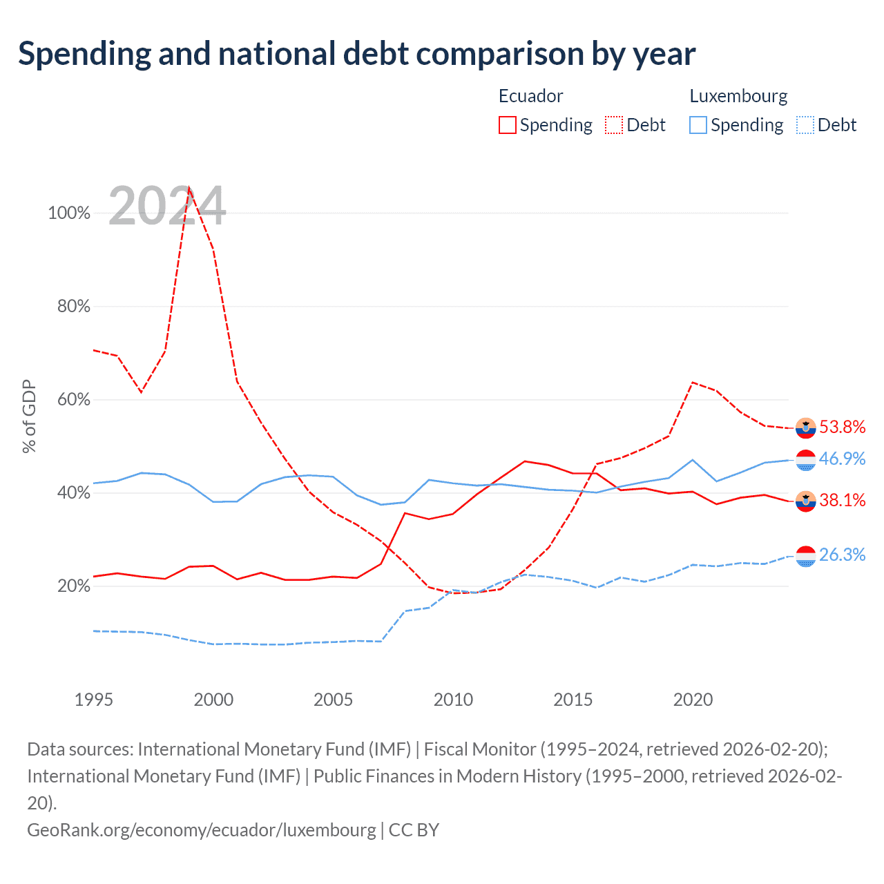 Ecuador has $67B in government debt (53.8% of GDP), compared to $24.5B (26.3% of GDP) in Luxembourg.
