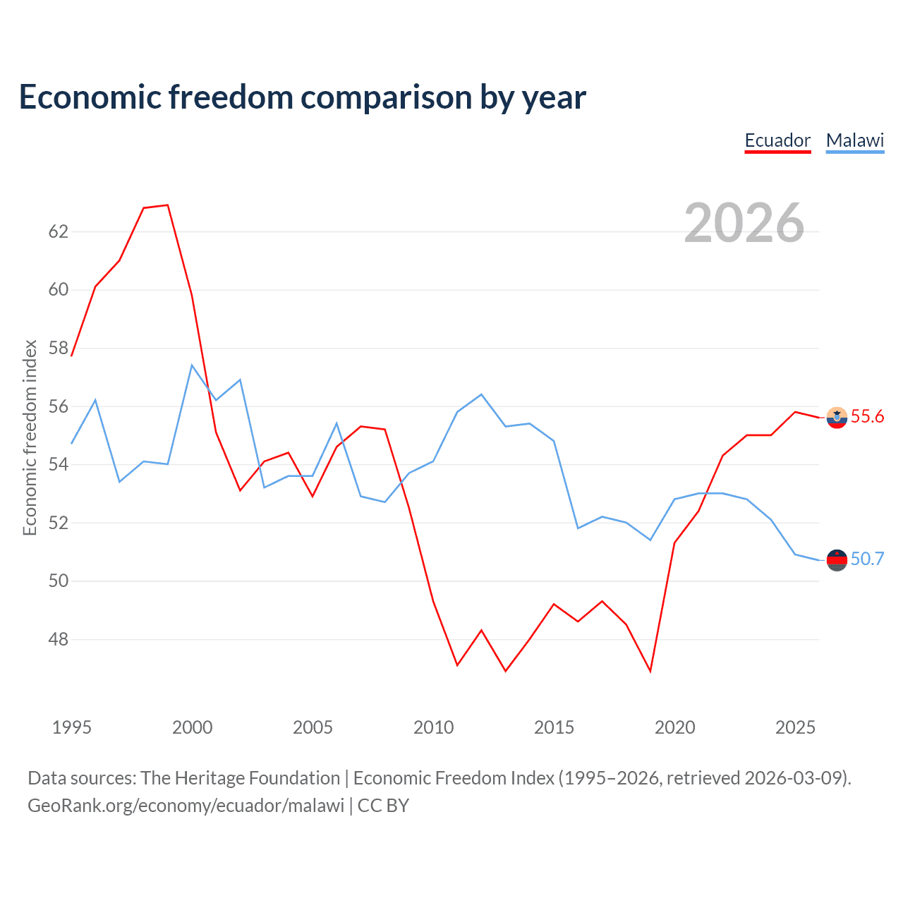 The Economic Freedom Index for Ecuador is 55.6, ranking 127/197, compared to 50.7 for Malawi, ranking 159/197. The chart above displays a comparison of annual changes in economic freedom indexes.