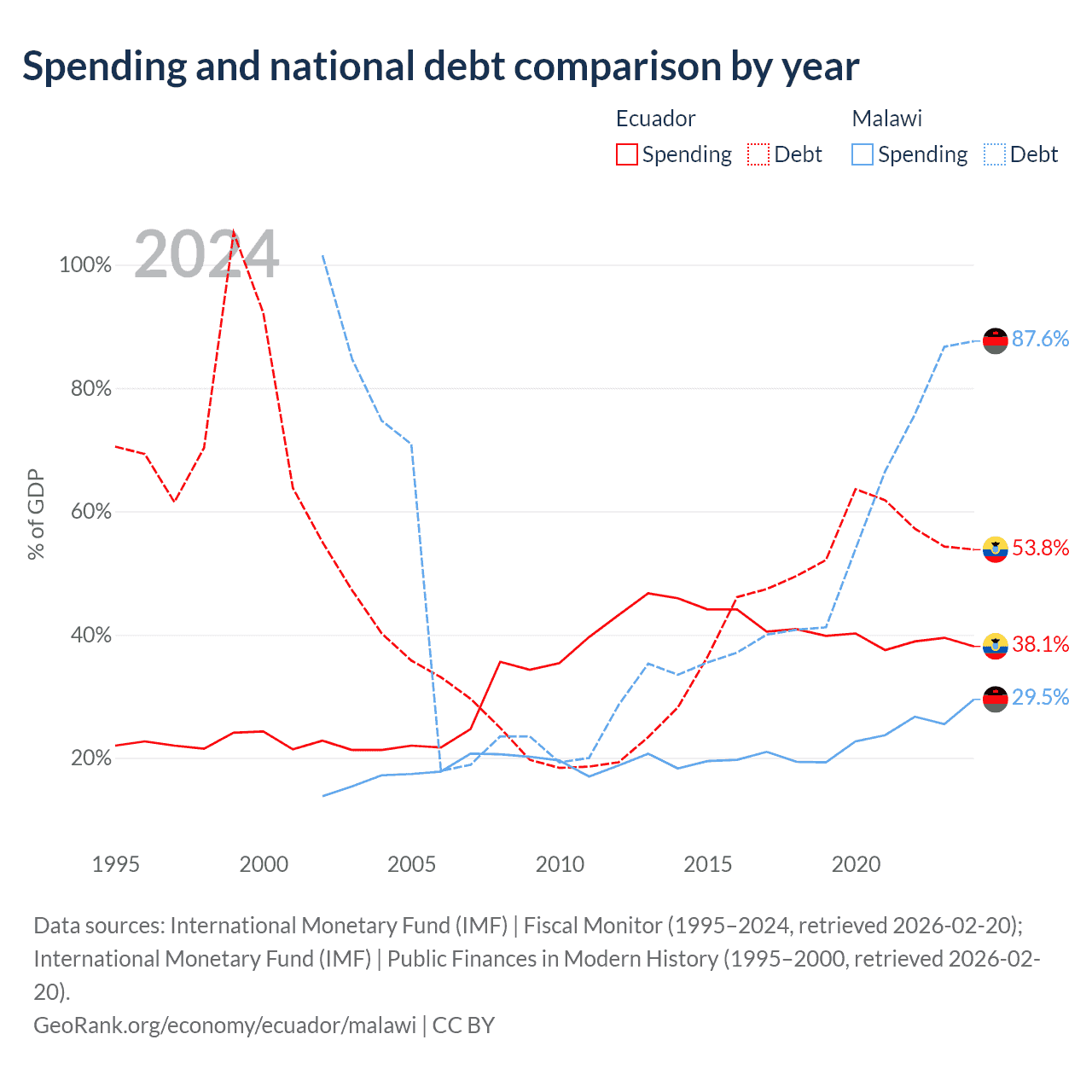 Ecuador has $67B in government debt (53.8% of GDP), compared to $9.91B (87.6% of GDP) in Malawi.